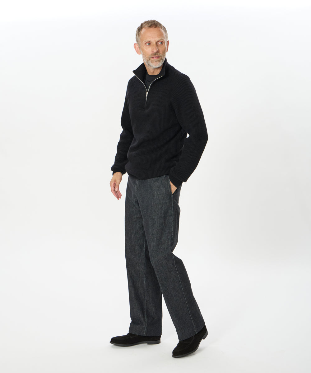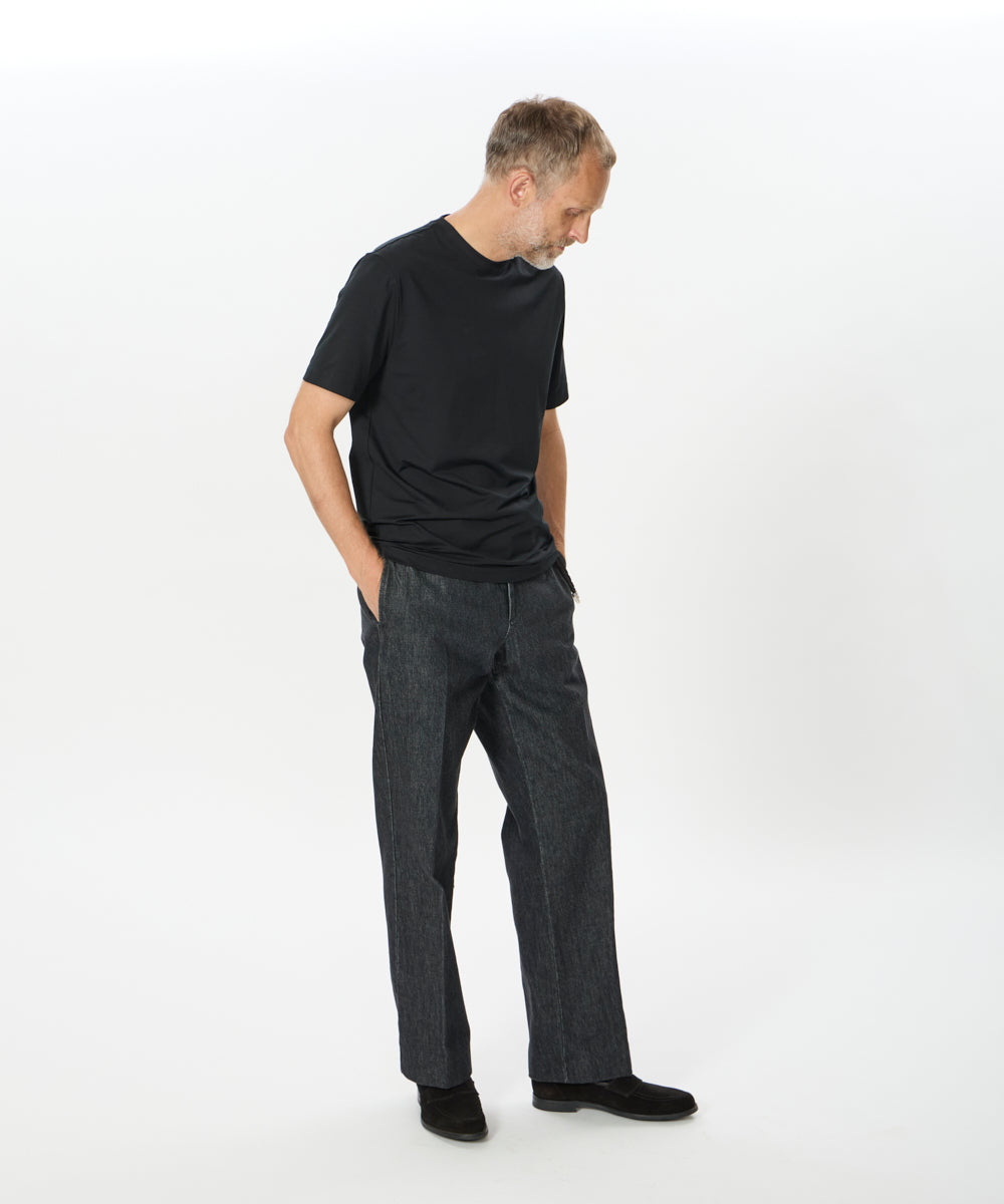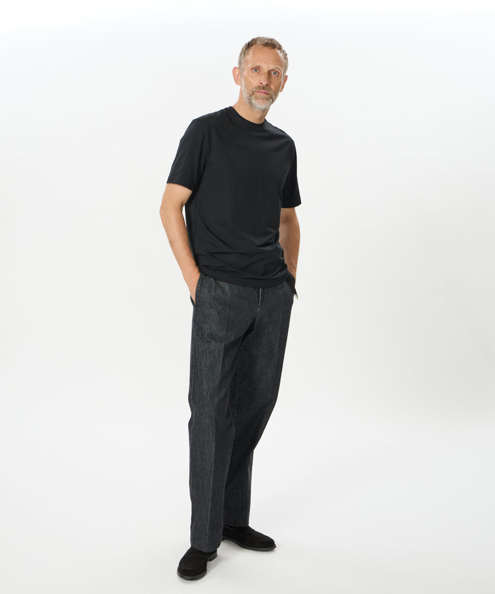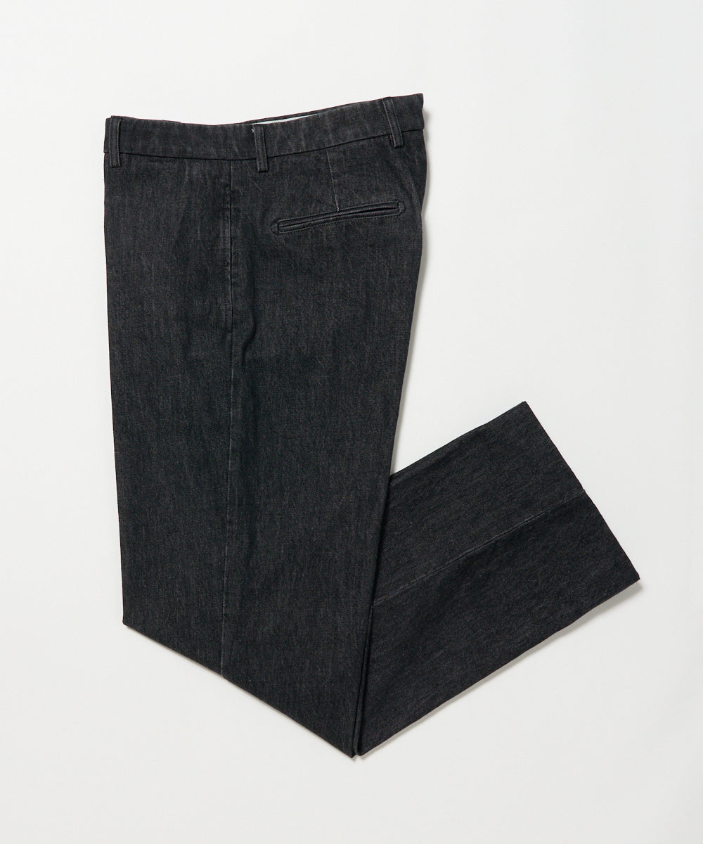 一見ニッチな印象を持たれるかもしれませんが、他とは一線を画す存在感を放つ、大人のための個性派パンツです。使用している生地は、岡山県井原市に拠点を構える老舗デニムメーカー「クロキ」が手掛ける高品質デニム。染色・織布・整理加工までを一貫して自社で行うことで、ハイブランドからも信頼を得るクオリティを実現しています。