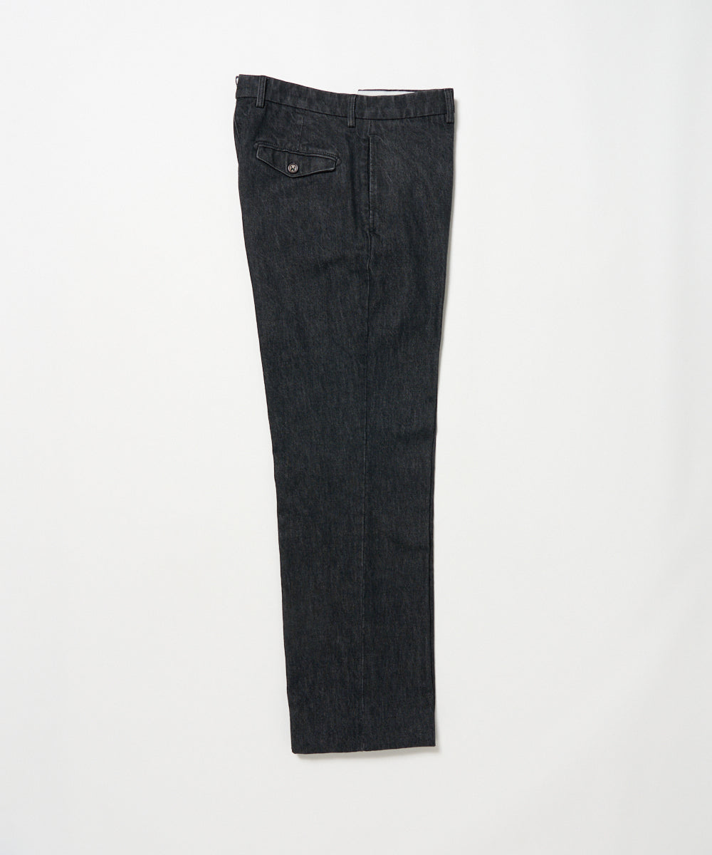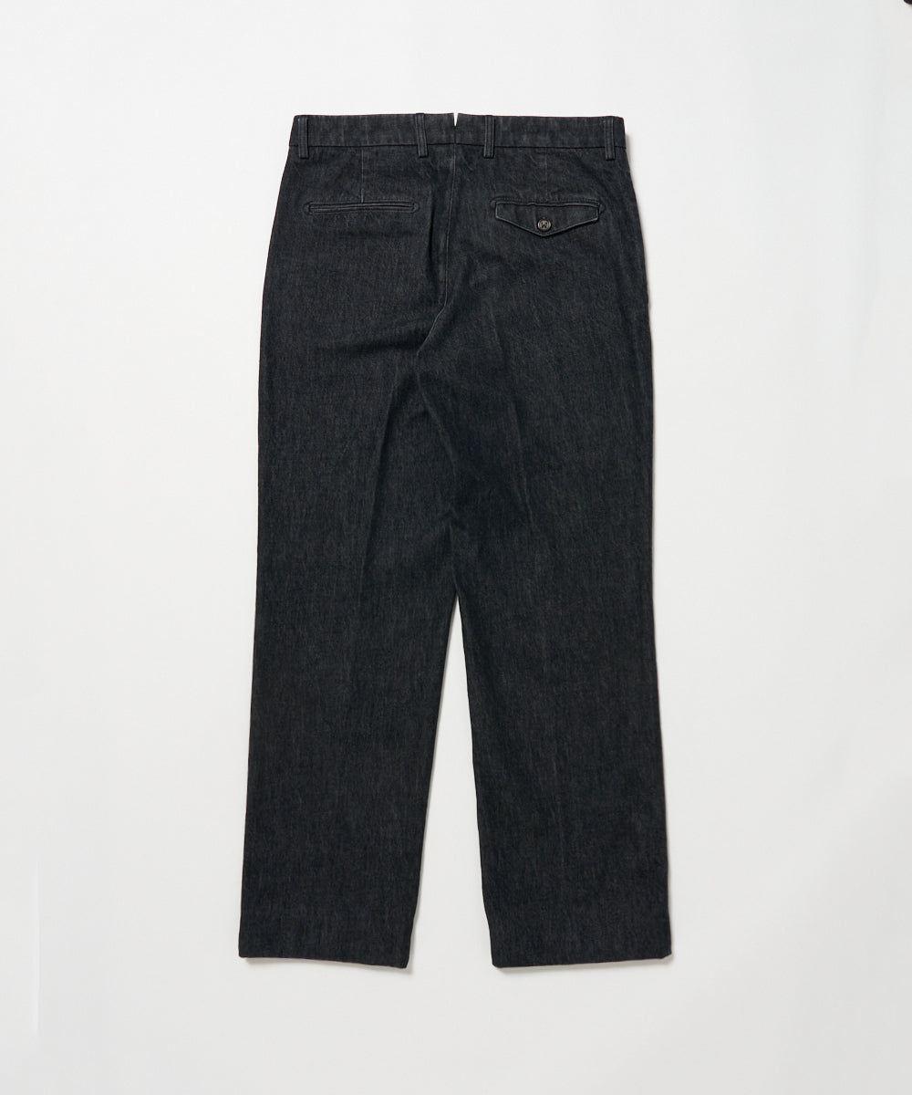 ディテールはウエスト周りがノープリーツ仕様。バックポケットは左右非対称で、左側がパイピングポケット、右側がフラップポケットになっており、実用性とデザイン性を兼ね備えています。裾は4cm幅で仕上げており、ダブル仕様での着用が可能。全体的にわたりから裾までストンと落ちるワイドストレートシルエットが特徴で、クラシックな中にもモード感を感じさせる1本です。