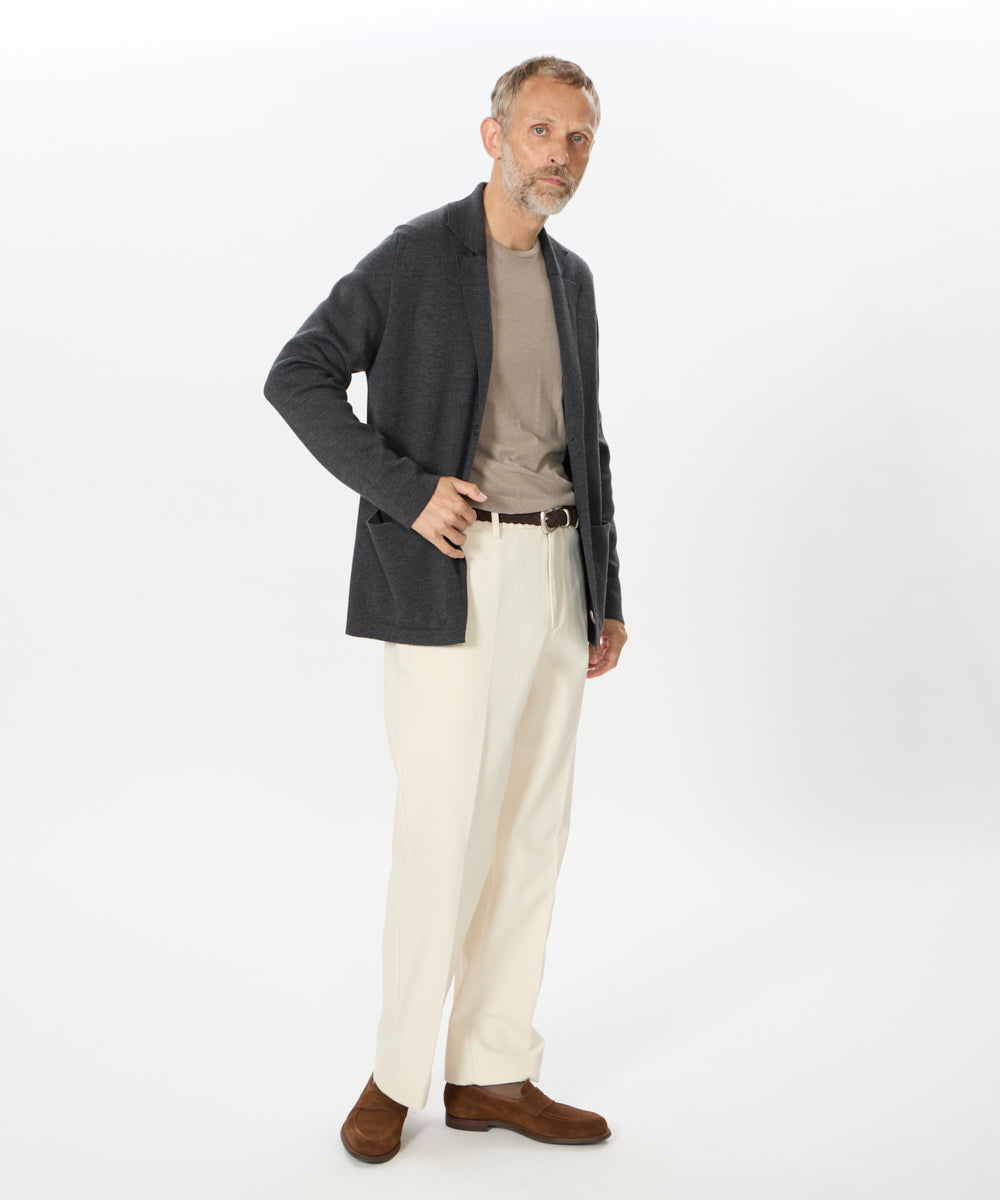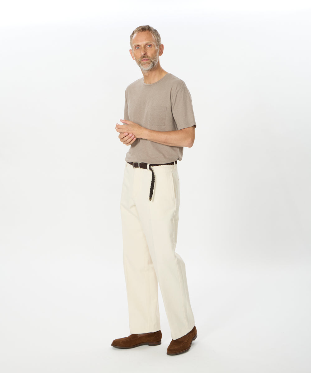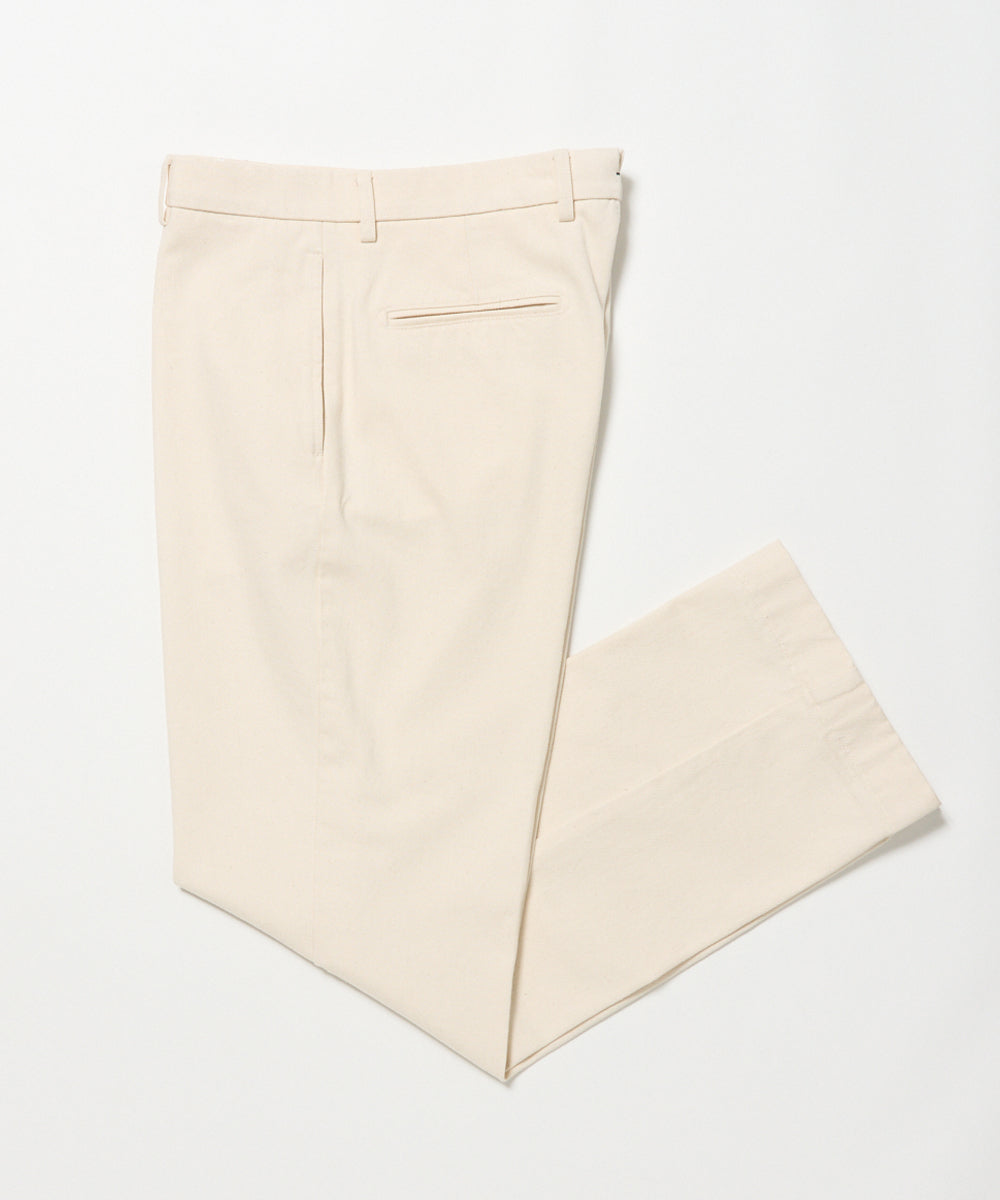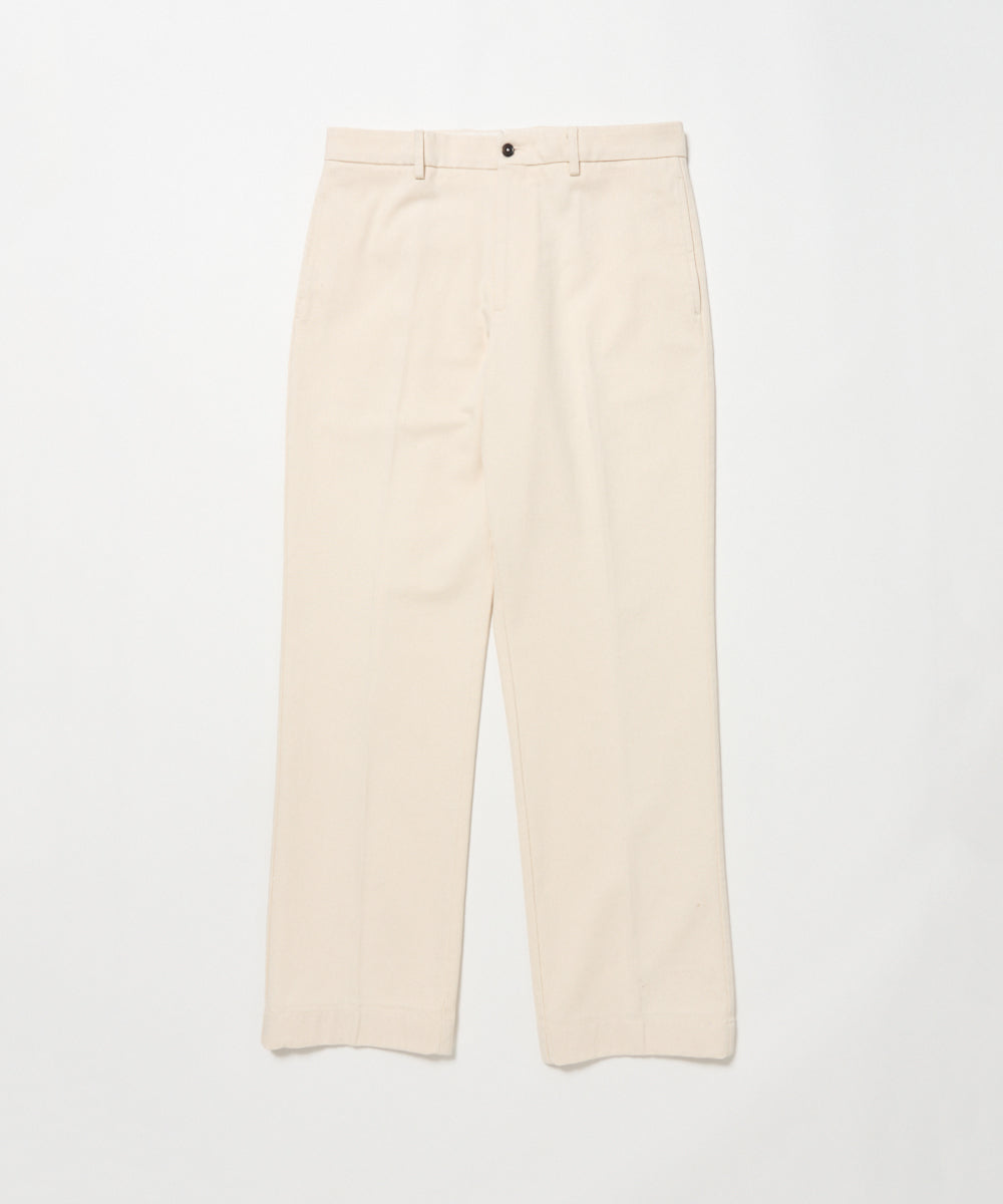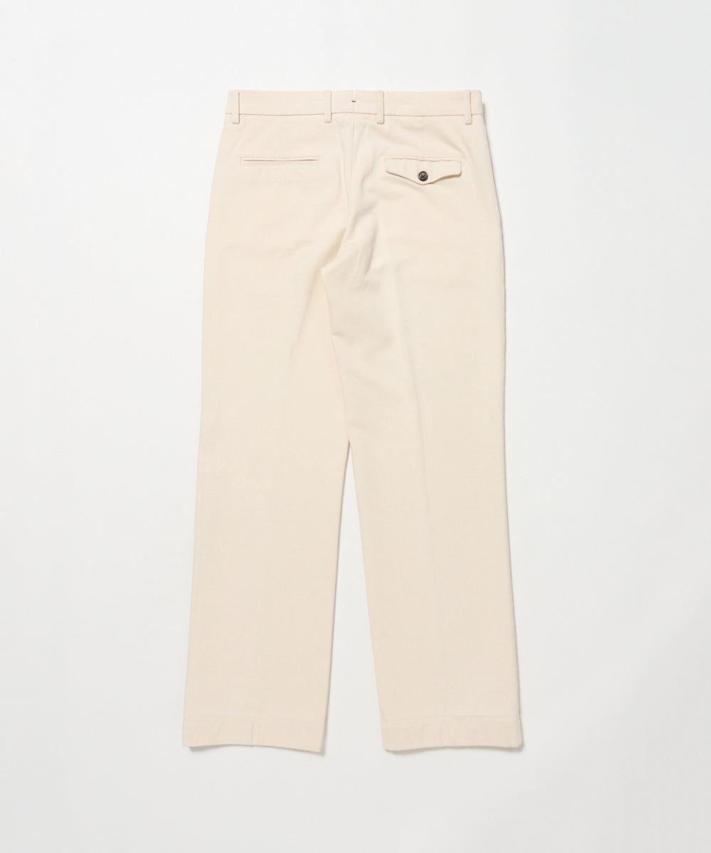 ディテールはウエスト周りがノープリーツ仕様。バックポケットは左右非対称で、左側がパイピングポケット、右側がフラップポケットになっており、実用性とデザイン性を兼ね備えています。裾は4cm幅で仕上げており、ダブル仕様での着用が可能。全体的にわたりから裾までストンと落ちるワイドストレートシルエットが特徴で、クラシックな中にもモード感を感じさせる1本です。