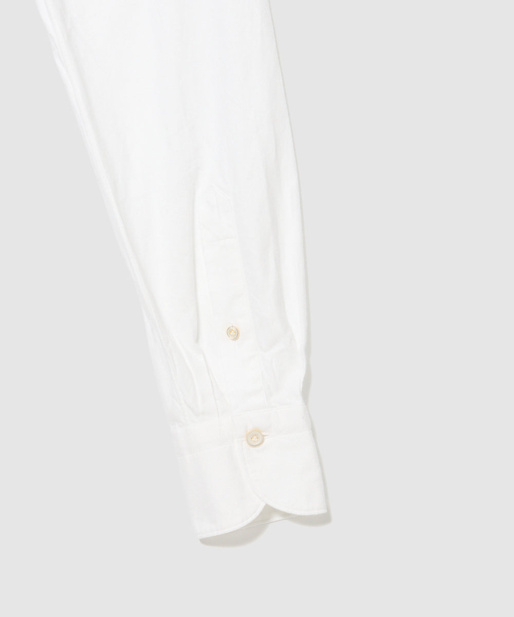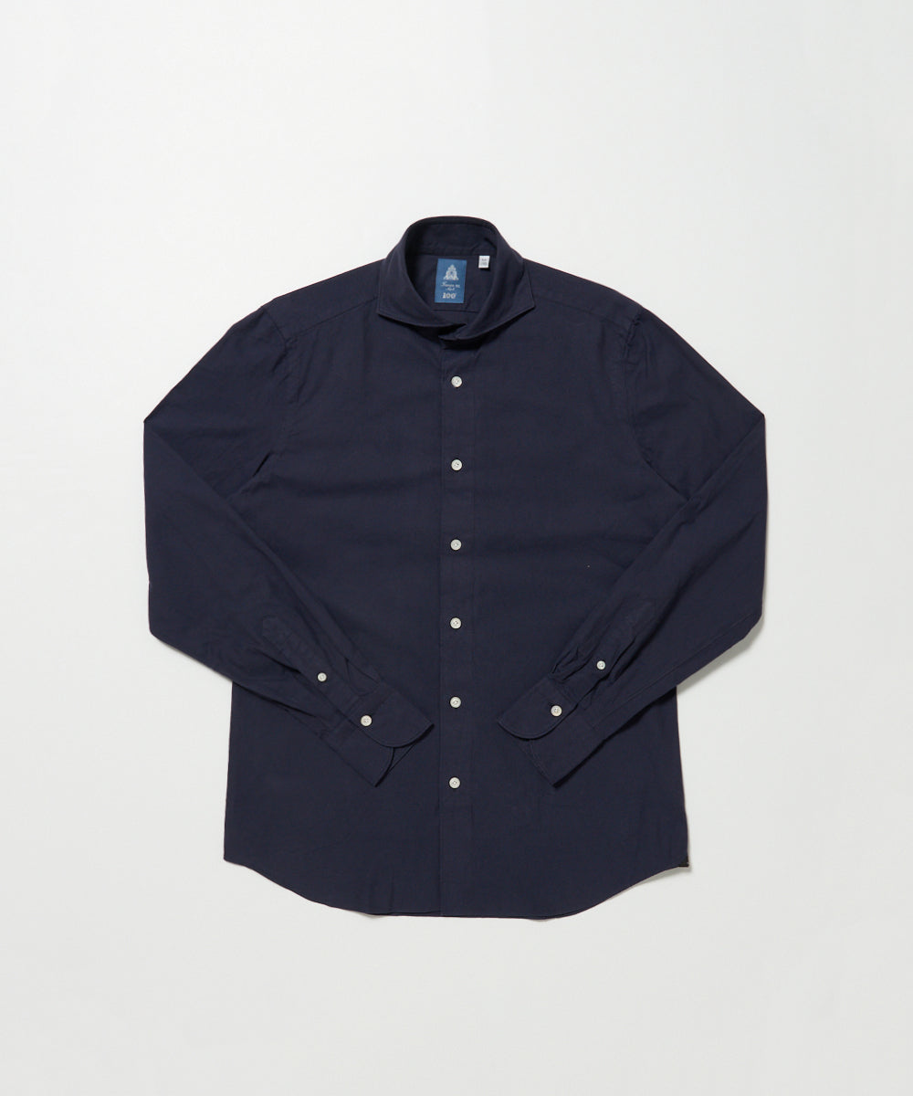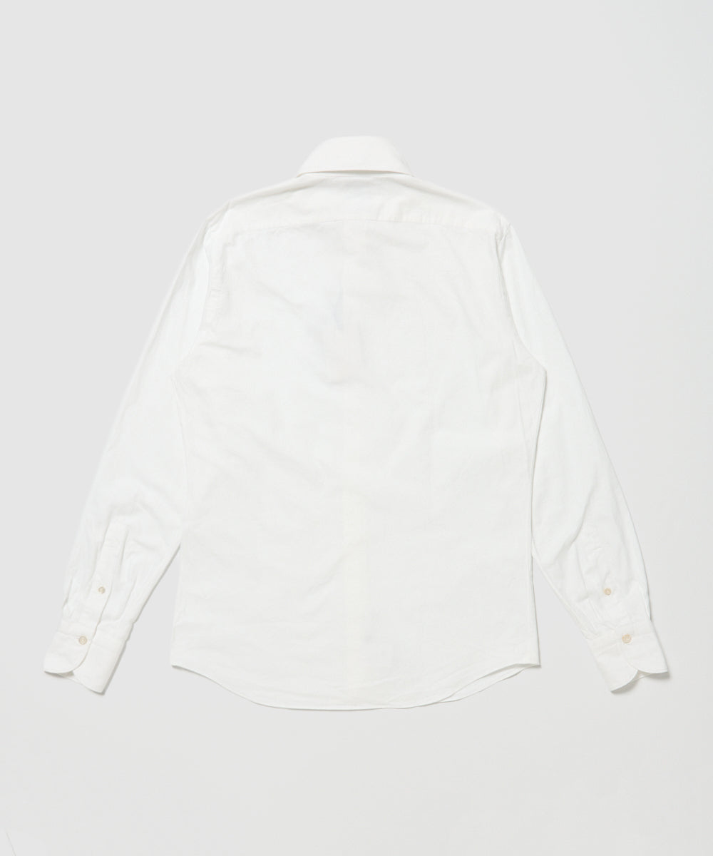 スポーツラインは袖付け、ボタン付け、ガゼット付けの3工程はハンドメイドで取付けている為、ハンドならではな風合い、動きを妨げないFinamore独自のパターンは秀逸です。ボディは、程よくリラックスした雰囲気で着用いただけるようレングスで、タックアウトした際にバランス良く着用いただけるよう計算された丈感となります。