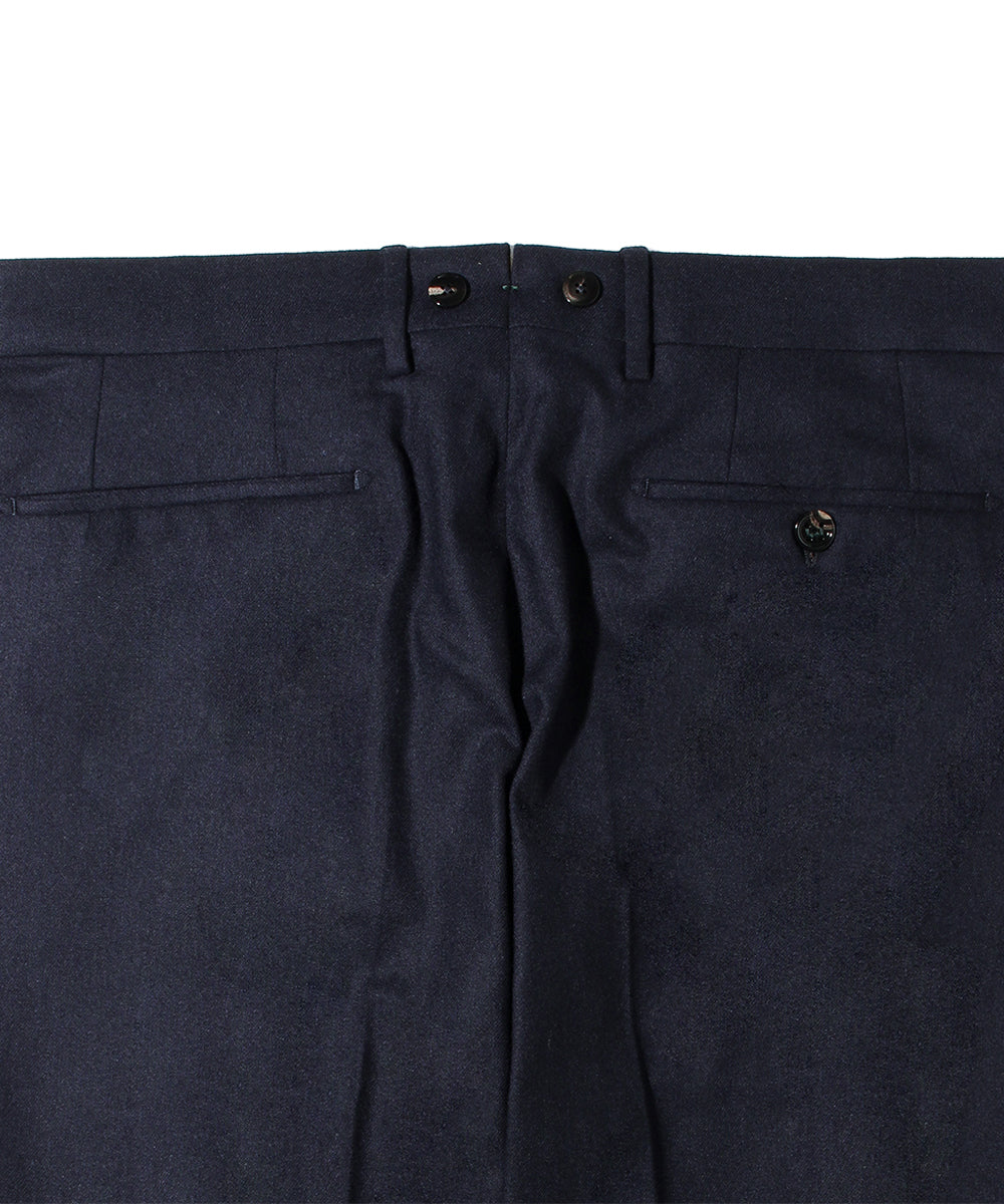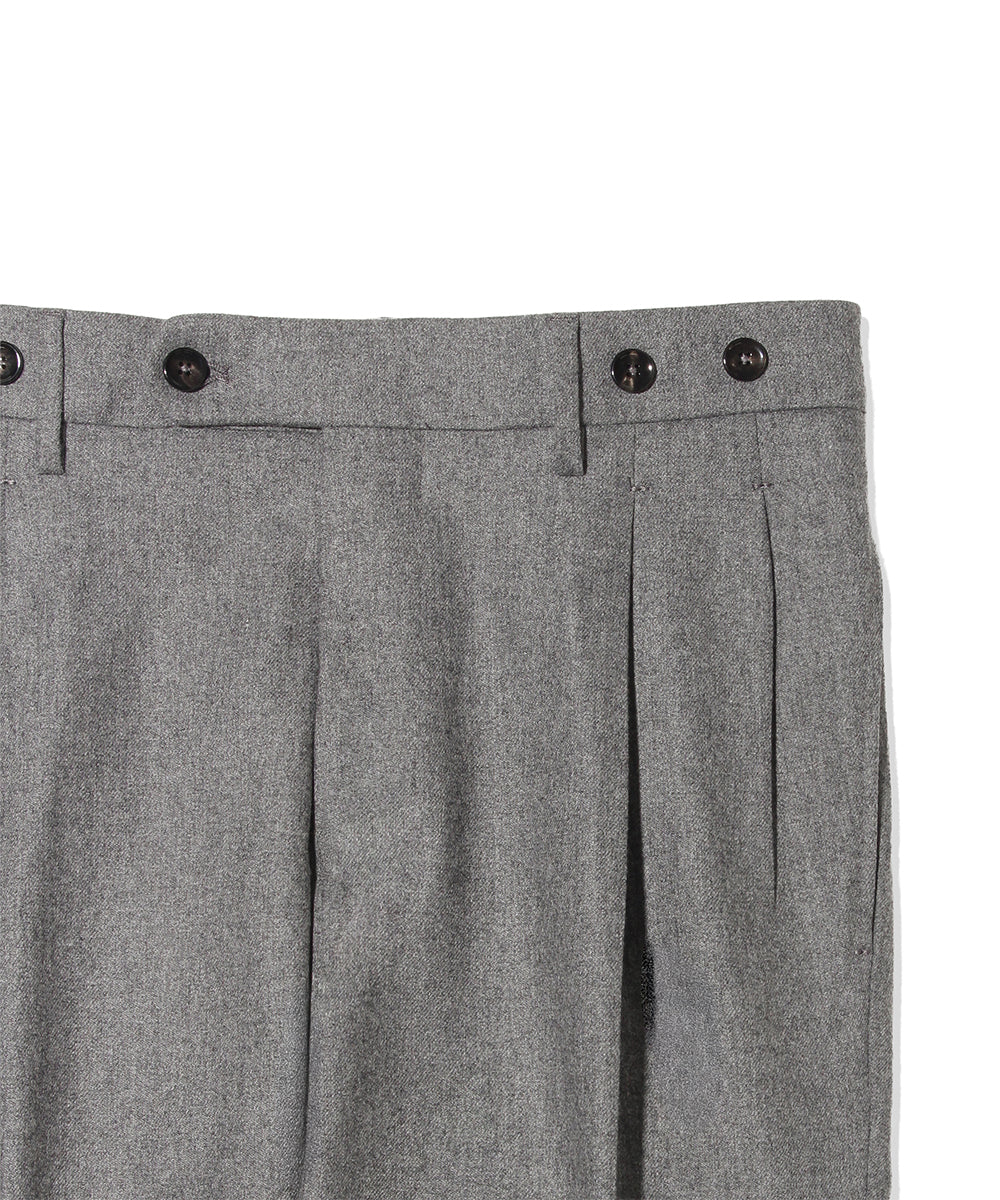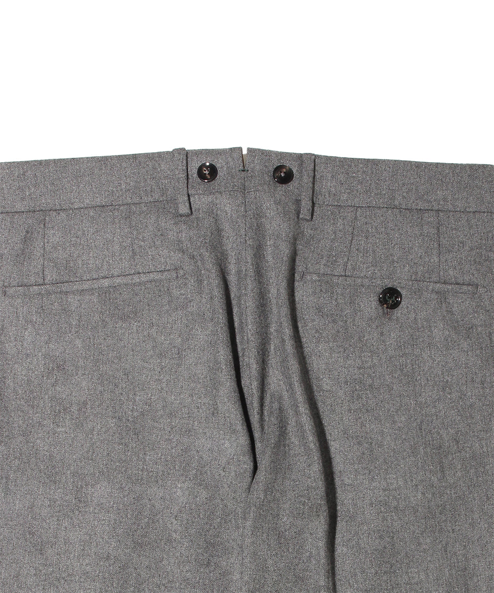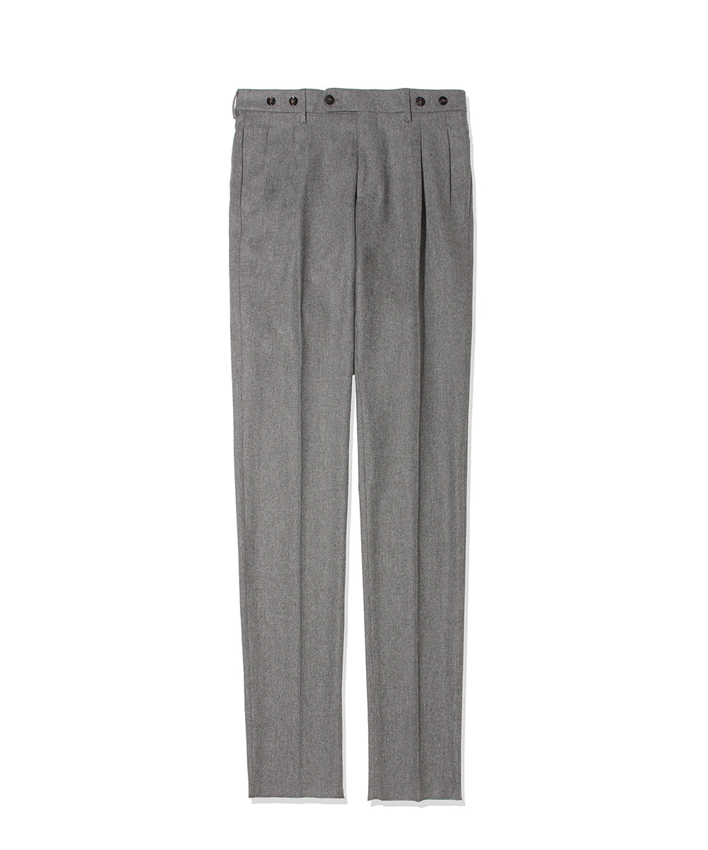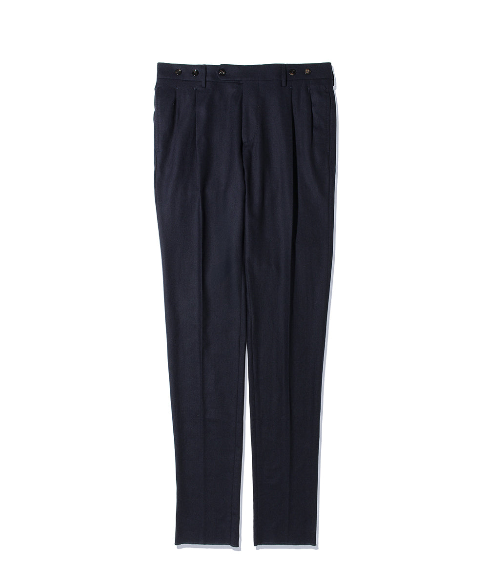 ディテールは、2アウトプリーツ、裾はアンフィニッシュ、ウエスマンにはサスペンダーボタンが付く、クラシックさも踏襲された1本です。