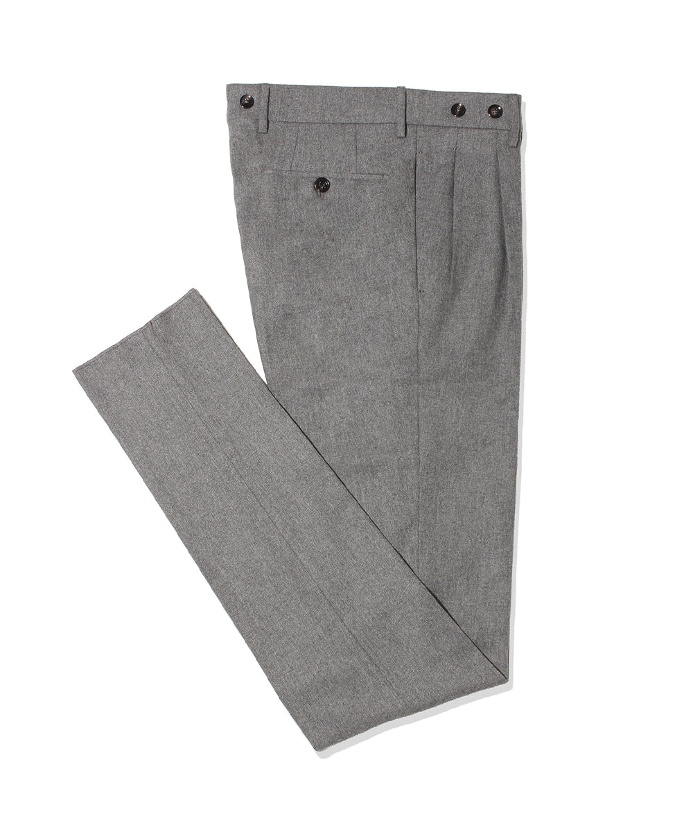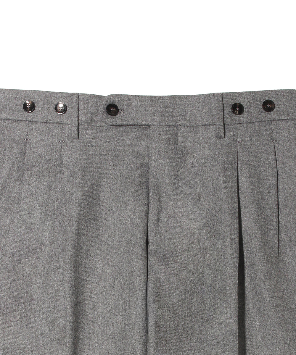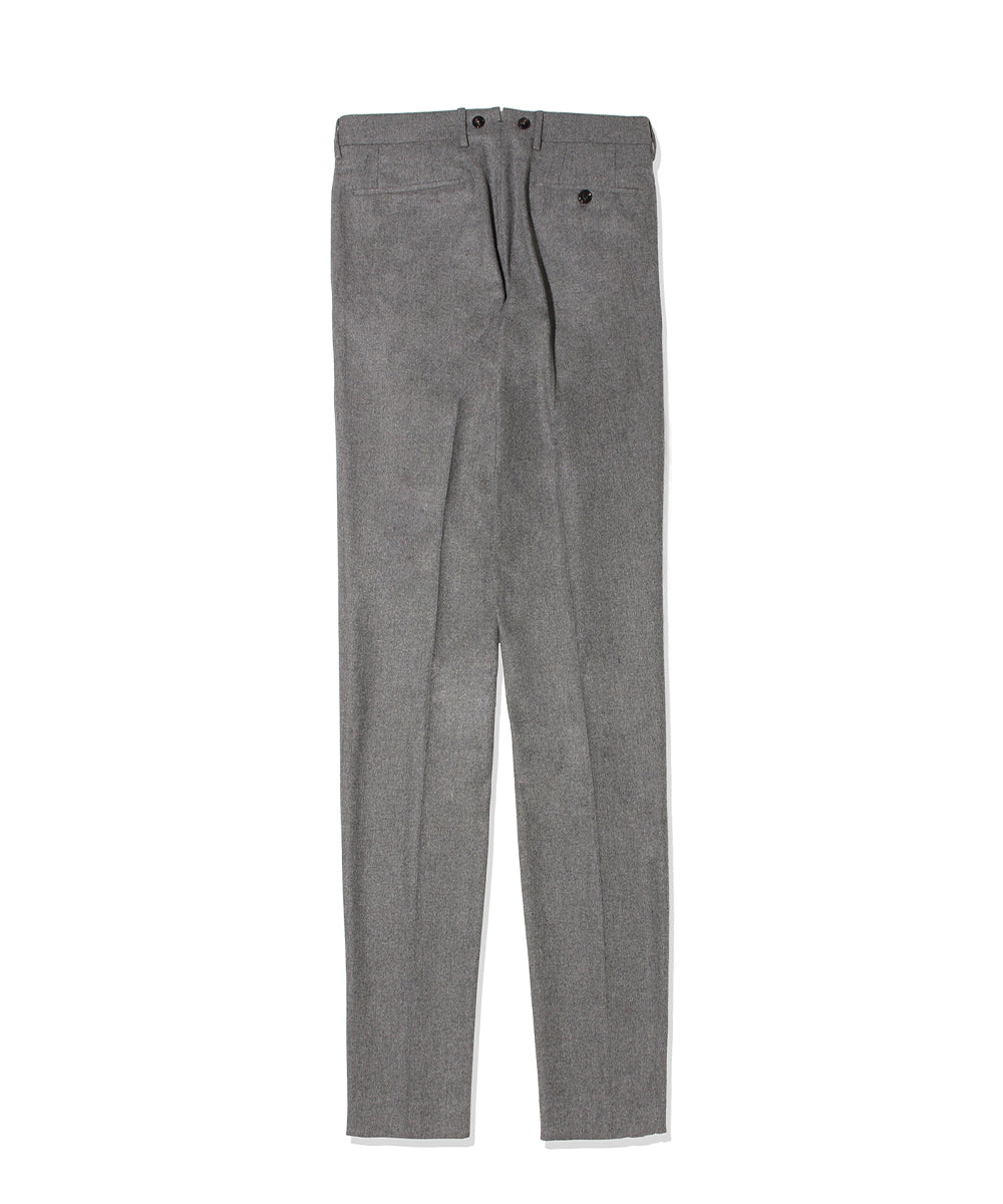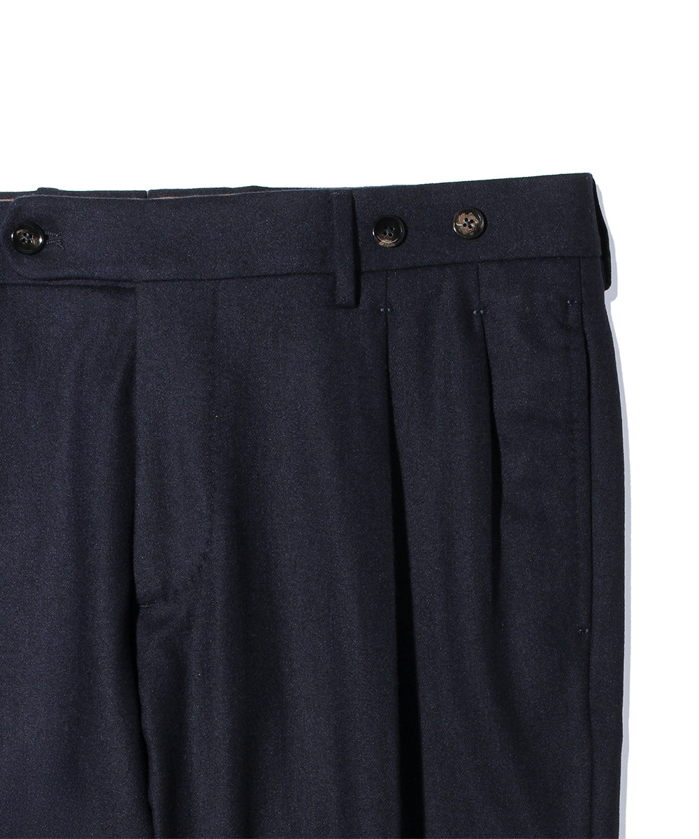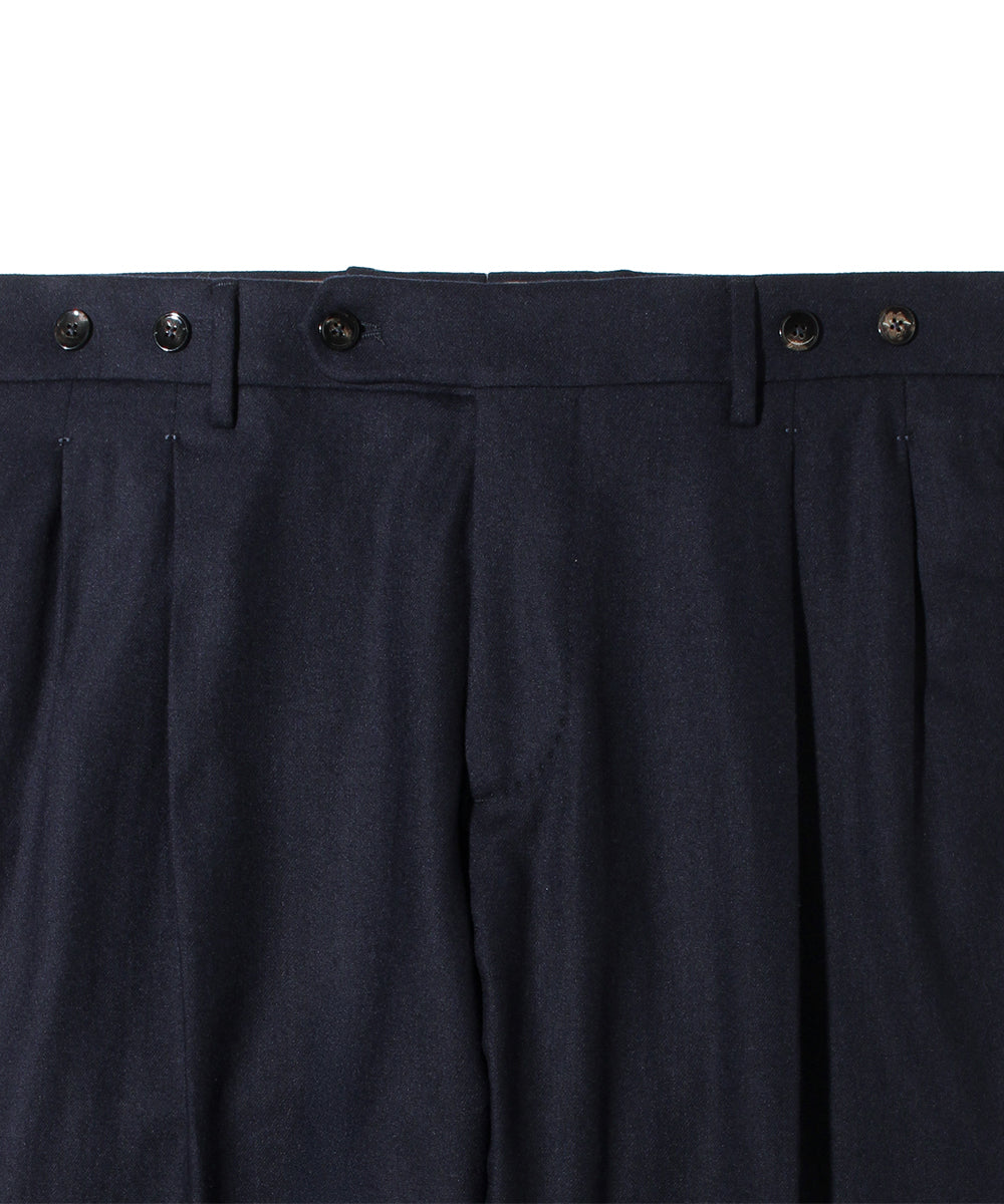 ディテールは、2アウトプリーツ、裾はアンフィニッシュ、ウエスマンにはサスペンダーボタンが付く、クラシックさも踏襲された1本です。