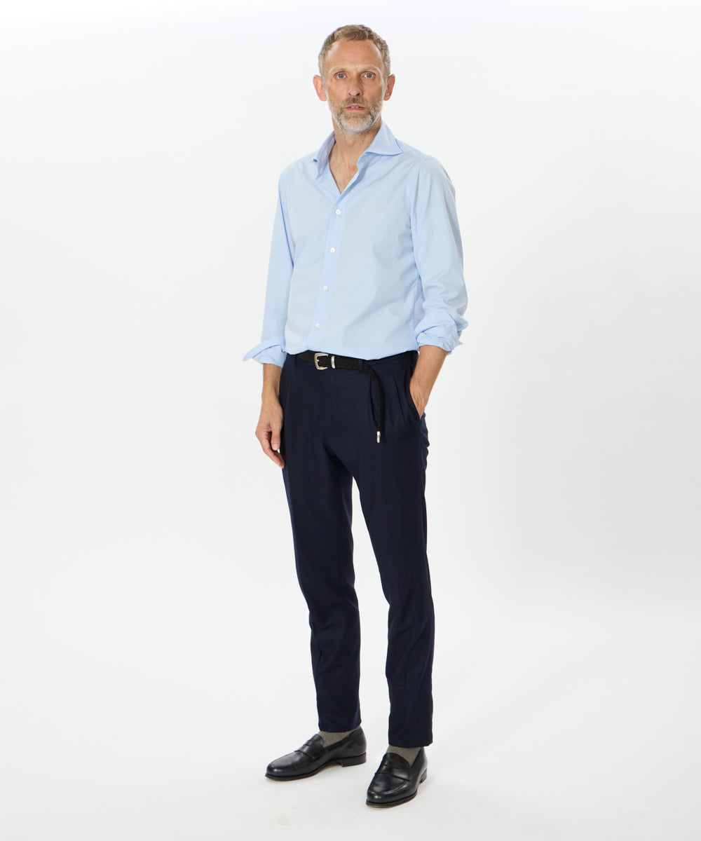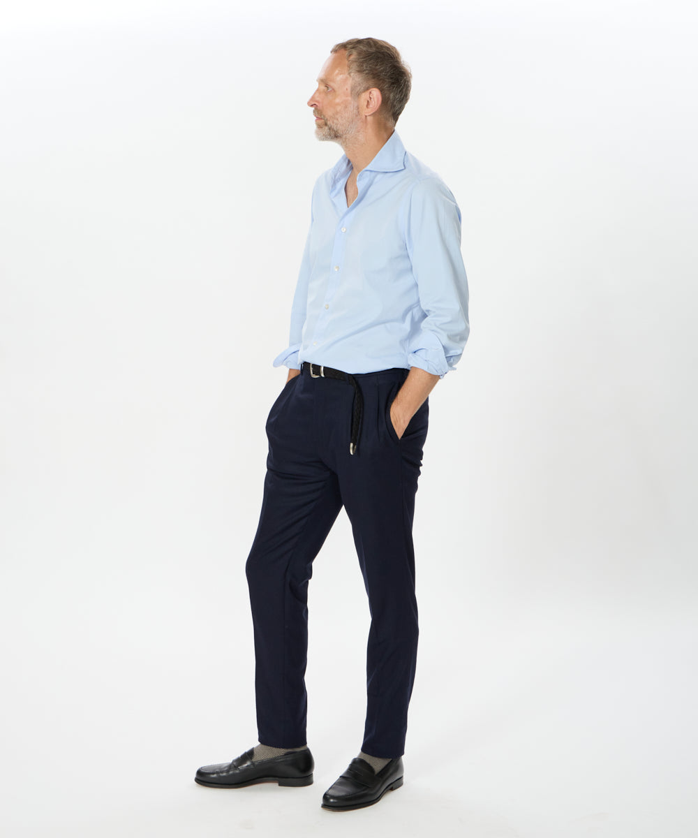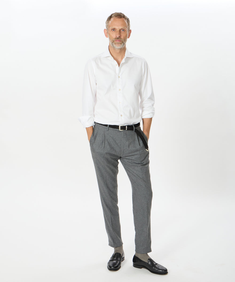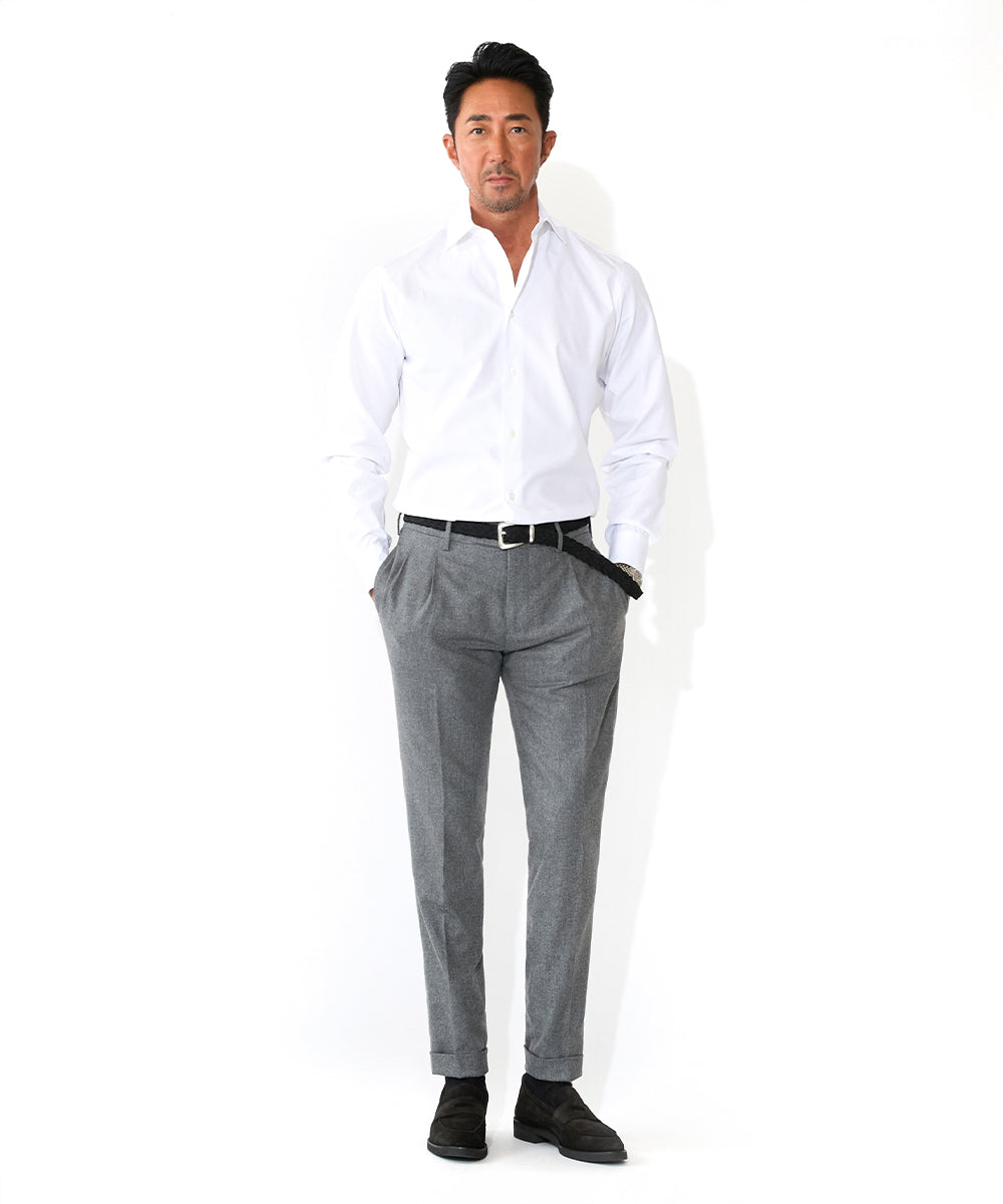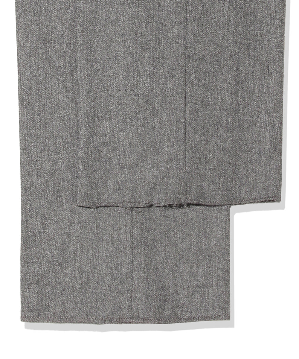 ディテールは、2アウトプリーツ、裾はアンフィニッシュ、ウエスマンにはサスペンダーボタンが付く、クラシックさも踏襲された1本です。
