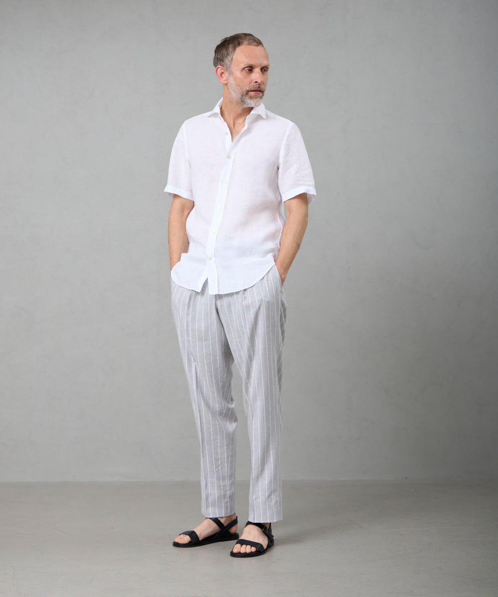 夏には欠かせないリネンファブリックを採用。リネンならではの高い通気性と吸湿性により、熱がこもりにくく、快適な着心地を保ちます。リネン特有のさりげないシワ感が生み出す表情は、かっちりしすぎない抜け感を演出。着込むほどに柔らかさが増し、身体に馴染むリネンの経年変化は、大人のカジュアルスタイルにさりげない品格をもたらします。