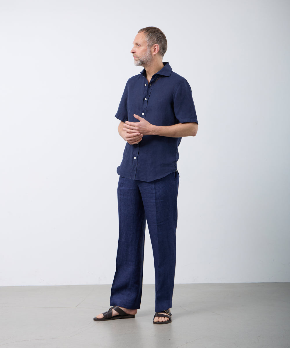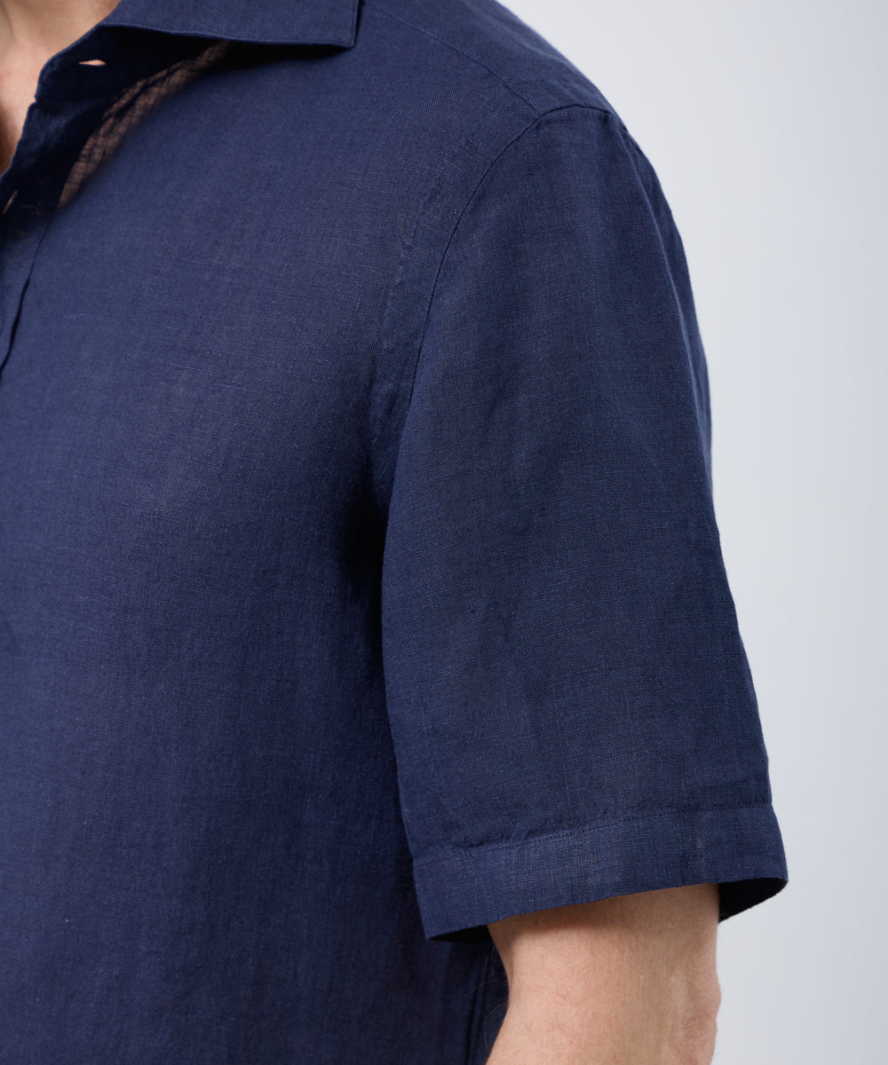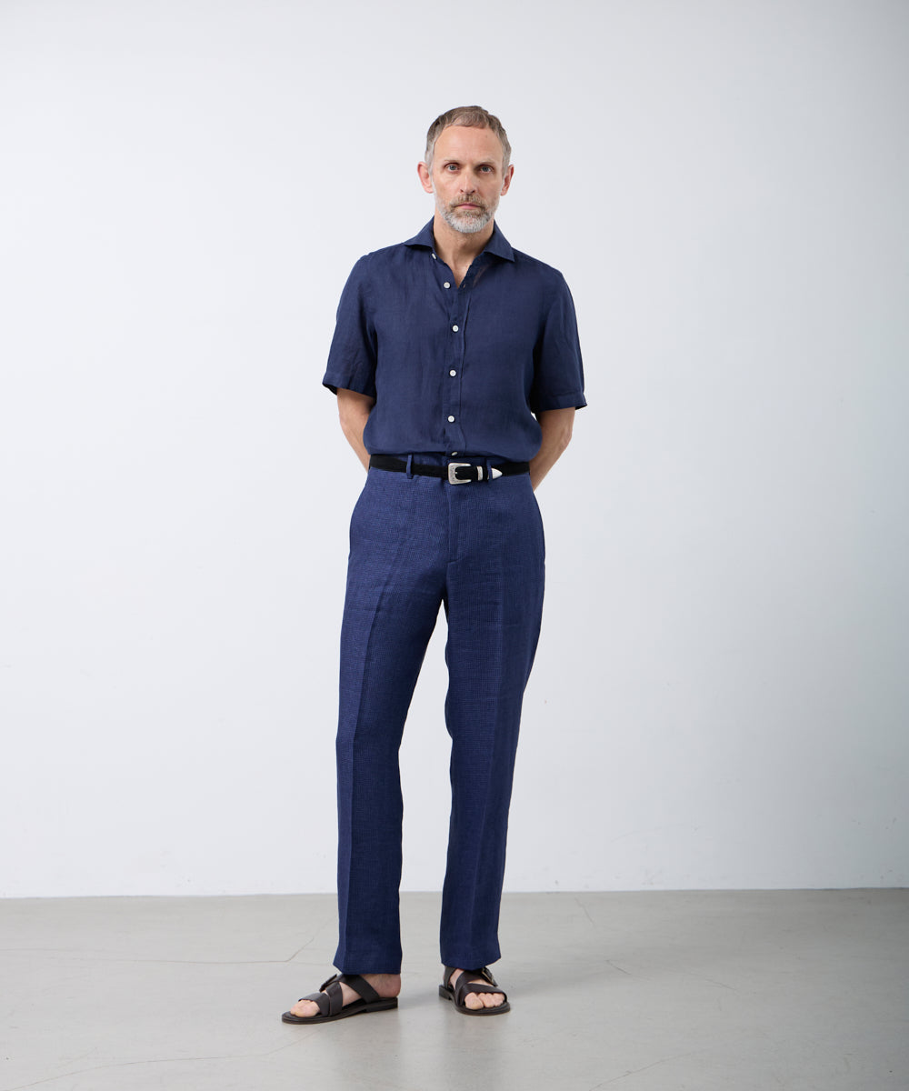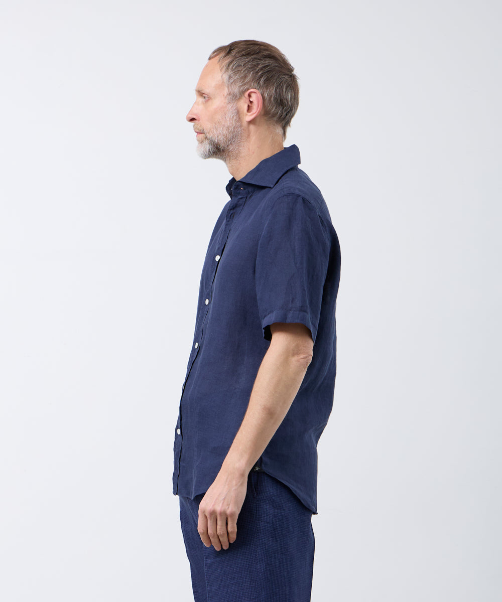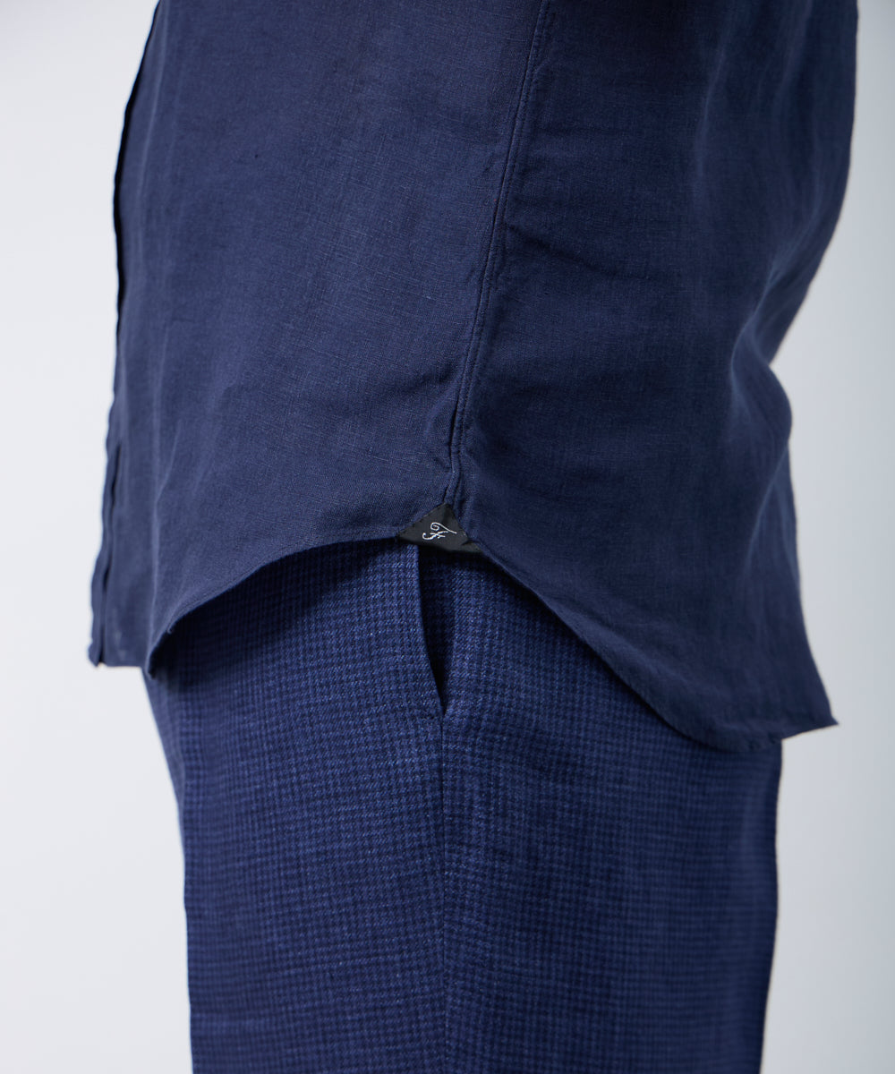 夏には欠かせないリネンファブリックを採用。リネンならではの高い通気性と吸湿性により、熱がこもりにくく、快適な着心地を保ちます。リネン特有のさりげないシワ感が生み出す表情は、かっちりしすぎない抜け感を演出。着込むほどに柔らかさが増し、身体に馴染むリネンの経年変化は、大人のカジュアルスタイルにさりげない品格をもたらします。