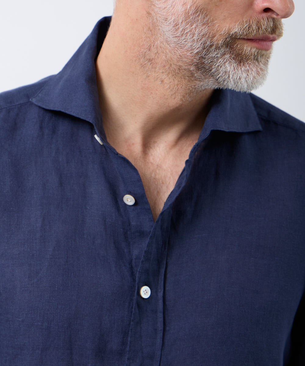 「PANTELLERIA(パンテレリア)」は、衿から前立てまでを一枚の生地でつなげた仕様が特徴。衿が程よく美しく開くよう、第2ボタンの位置を通常のシャツよりやや低めに設定しています。そのため、ボタンを開けて着用した際も襟の収まりがよく、柔らかな表情が生まれるのがポイント。程よく力の抜けた、リラックス感のある印象を演出します。