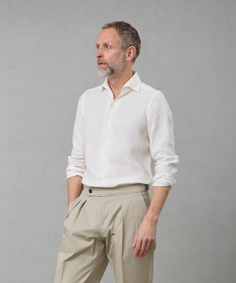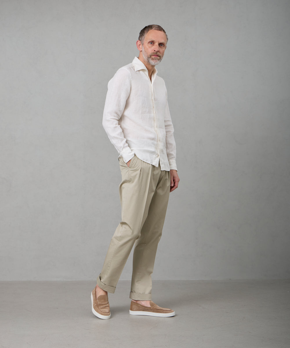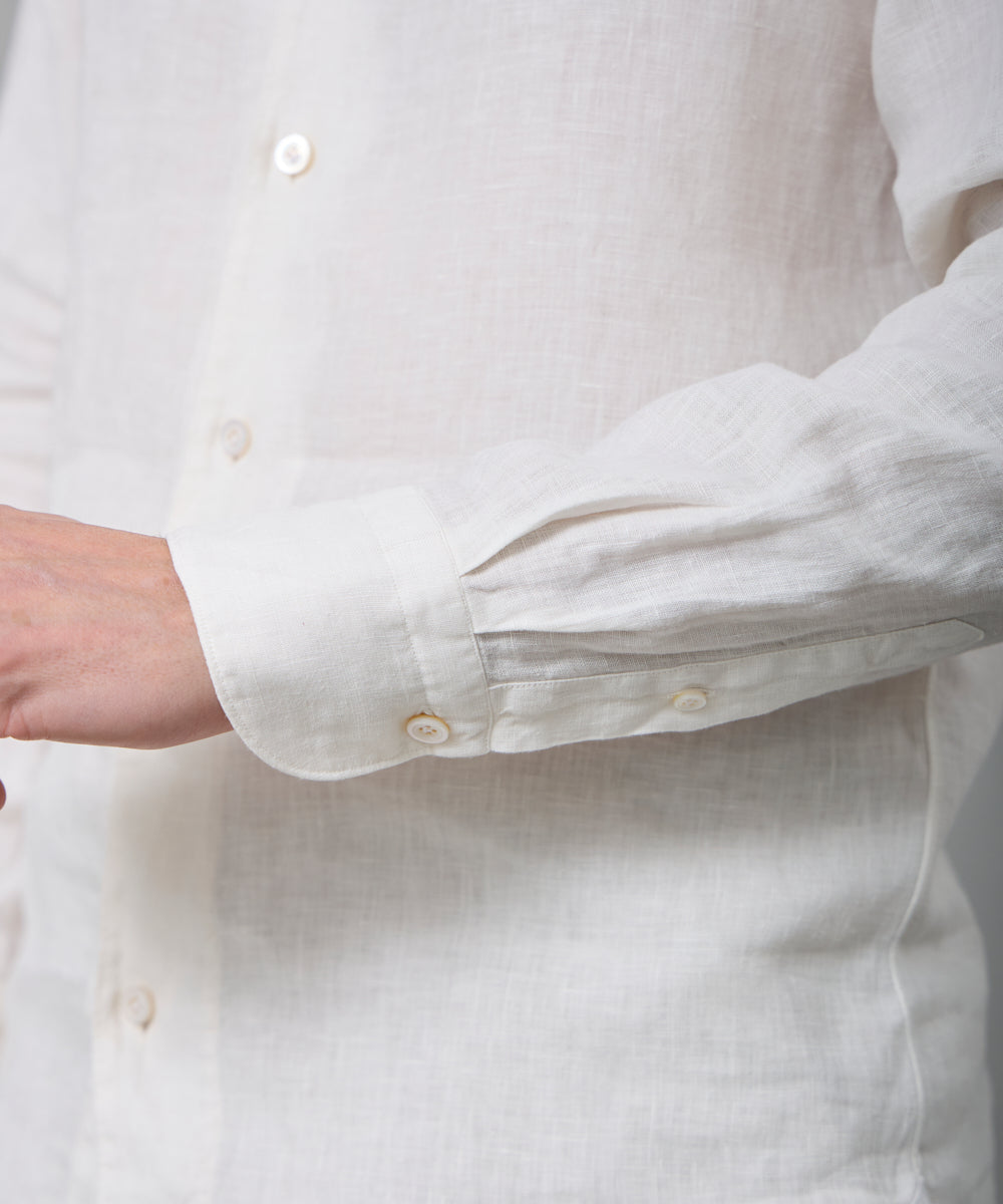 夏には欠かせないリネンファブリックを採用。リネンならではの高い通気性と吸湿性により、熱がこもりにくく、快適な着心地を保ちます。リネン特有のさりげないシワ感が生み出す表情は、かっちりしすぎない抜け感を演出。着込むほどに柔らかさが増し、身体に馴染むリネンの経年変化は、大人のカジュアルスタイルにさりげない品格をもたらします。カラーは、イタリアならではのペールカラーを採用。主張しすぎず、それでいて確かな存在感を放つ色味です。