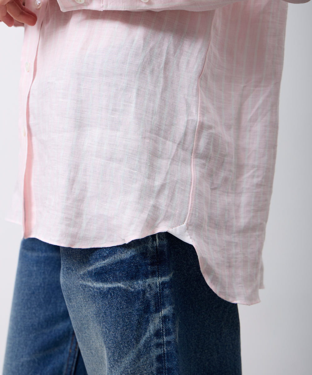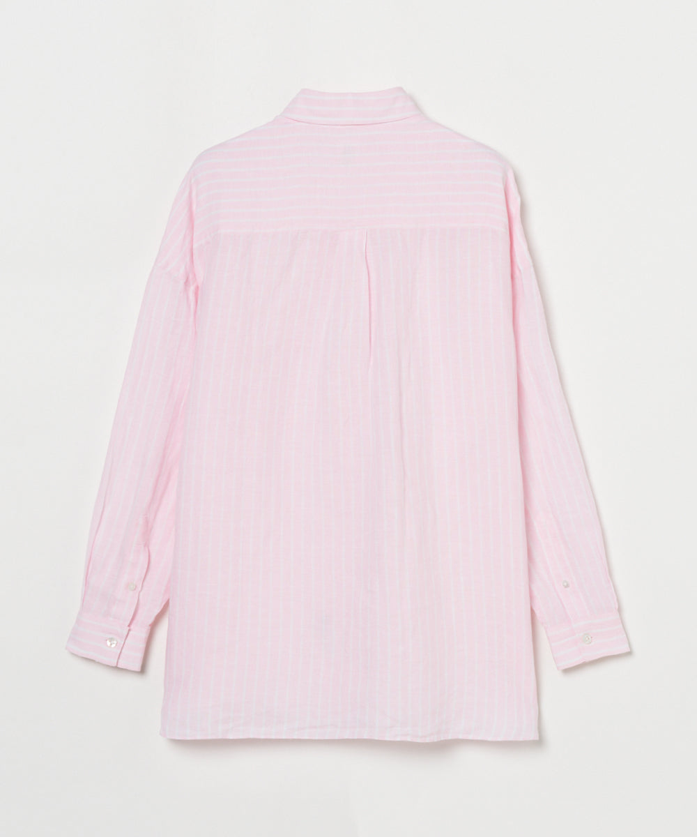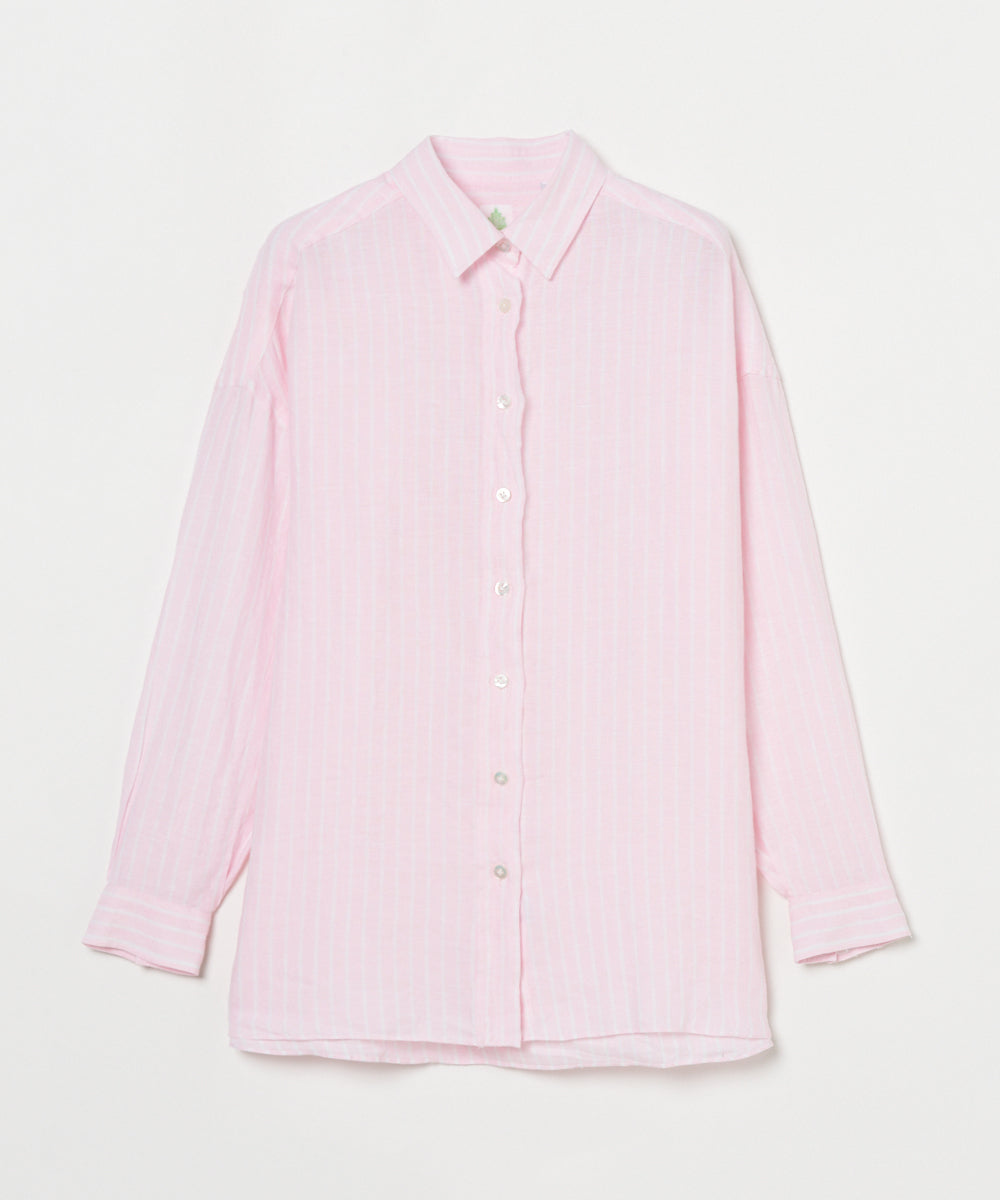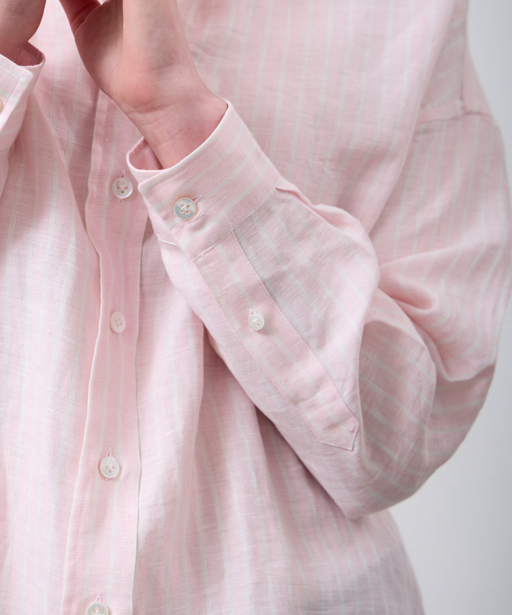 ゆったりとしたオーバーシルエットに、小さめの襟がさりげなく女性らしさをプラス。ピンクと白のストライプシャツは、明るく優しい印象を叶えてくれます。