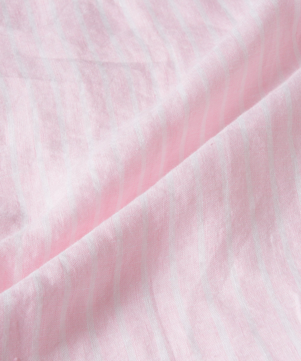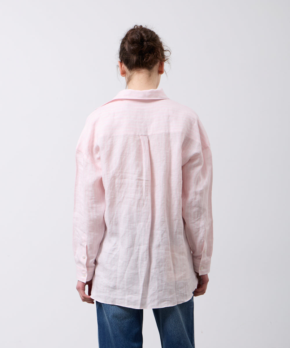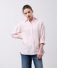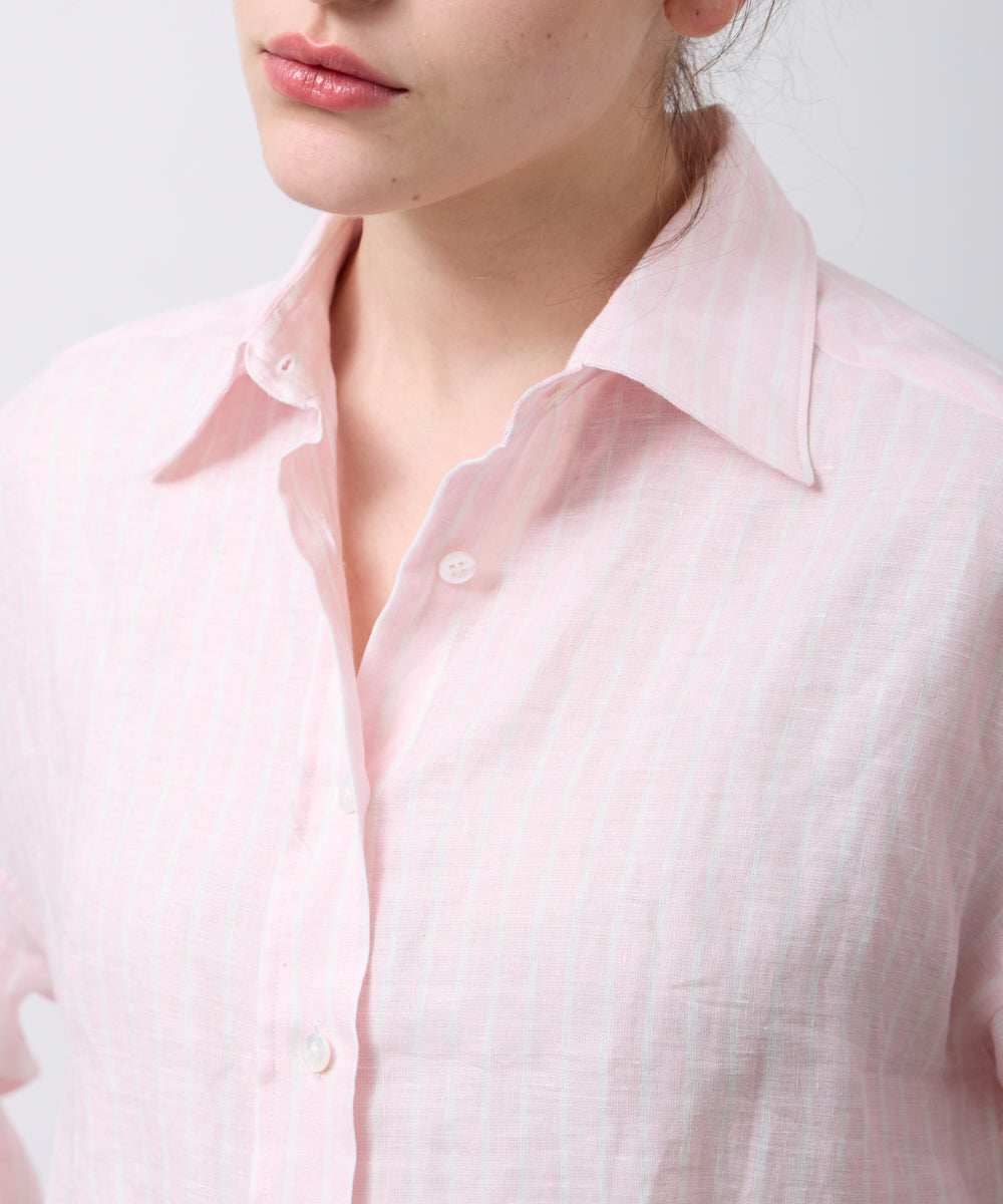 ゆったりとしたオーバーシルエットに、小さめの襟がさりげなく女性らしさをプラス。ピンクと白のストライプシャツは、明るく優しい印象を叶えてくれます。