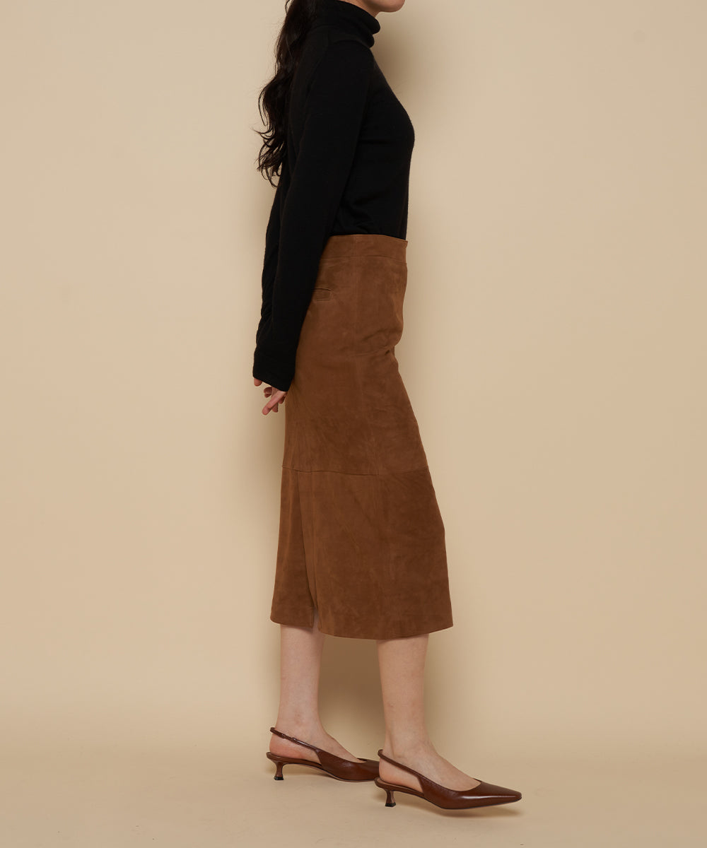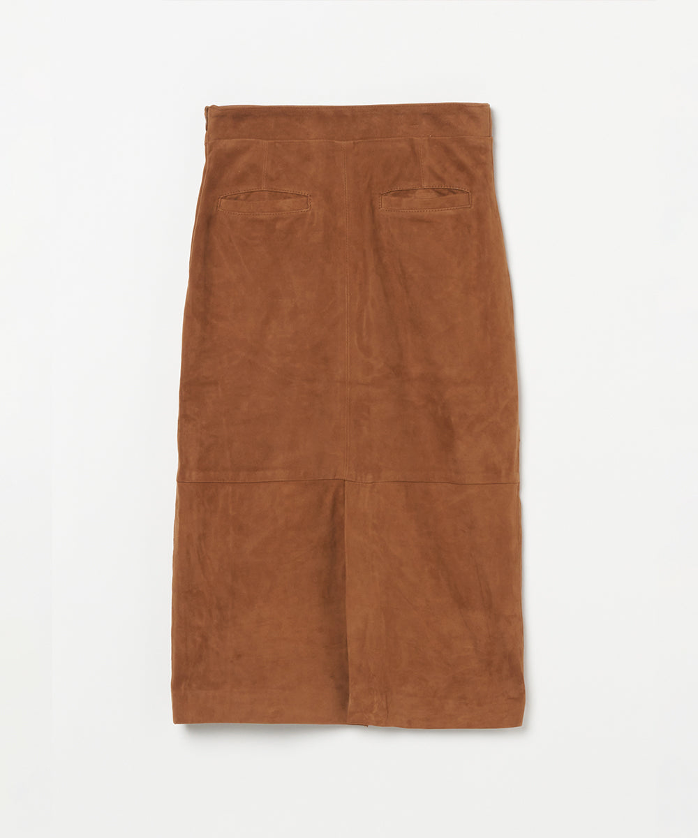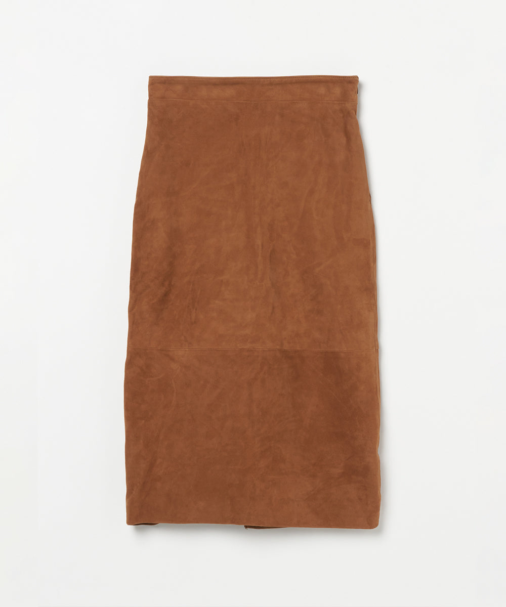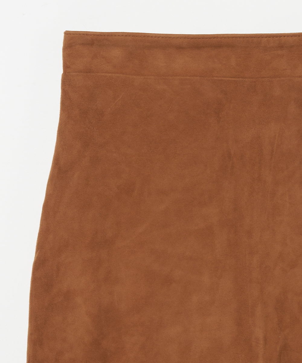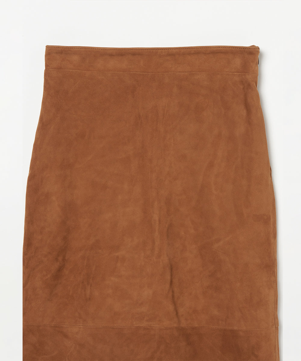 リアルスエードのタイトスカート。トレンドのロングブーツと合わせるとバランスの良い丈。