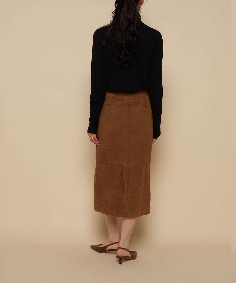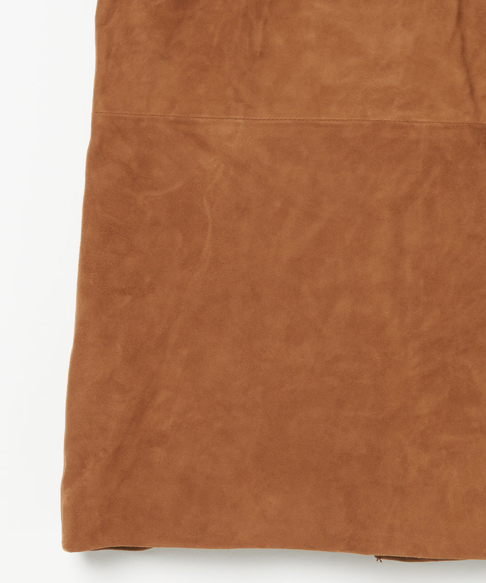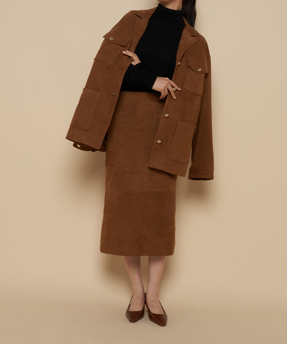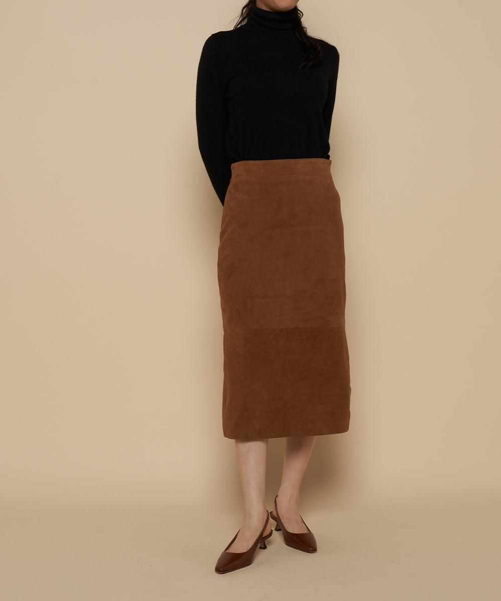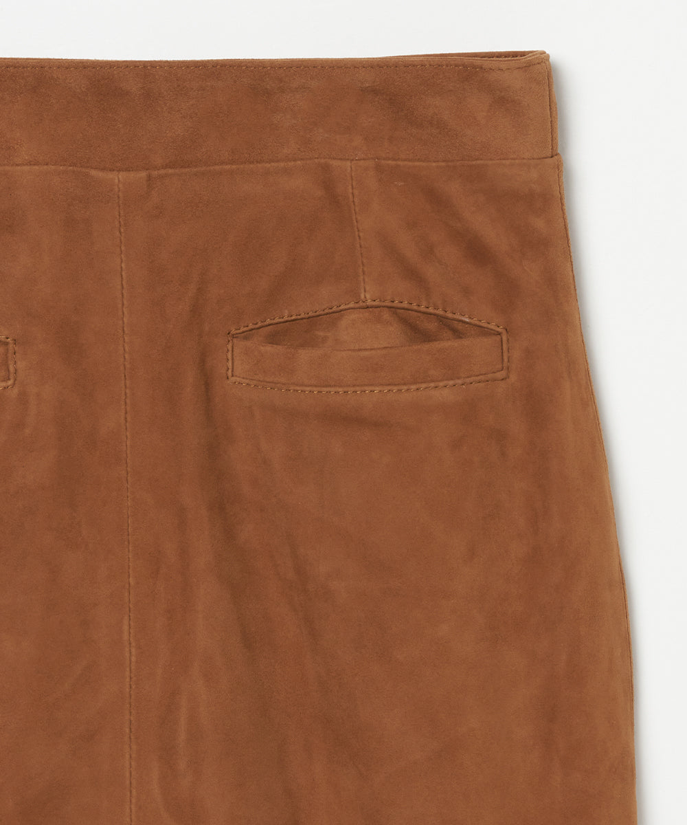 リアルスエードのタイトスカート。トレンドのロングブーツと合わせるとバランスの良い丈。