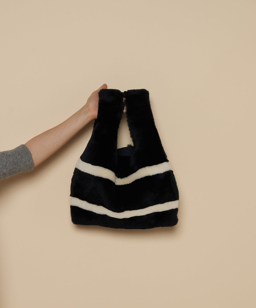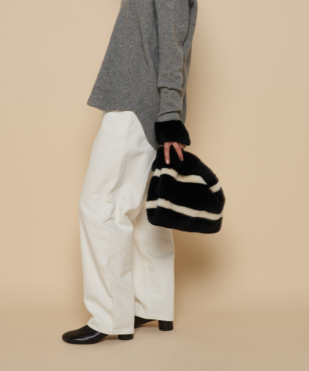 素材はリアルムートンながら遊び心のあるボーダーバッグ。大人のカジュアルコーディネートのアクセントに。