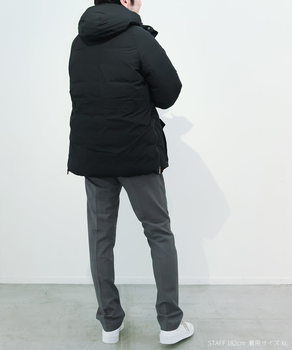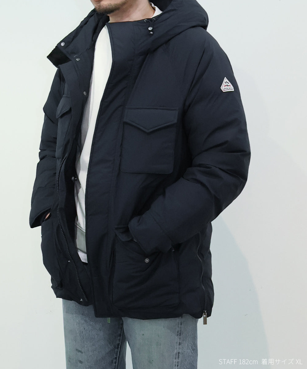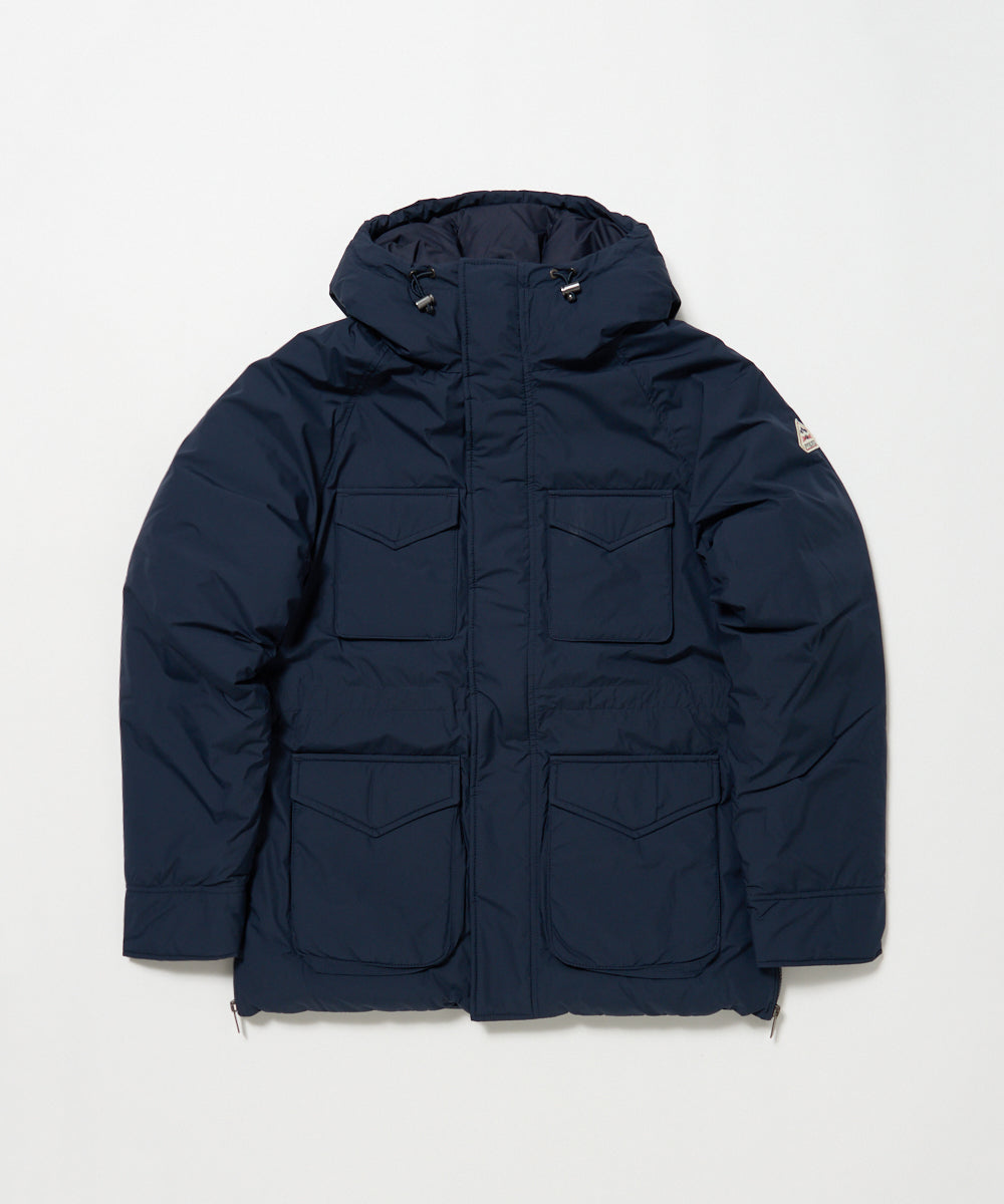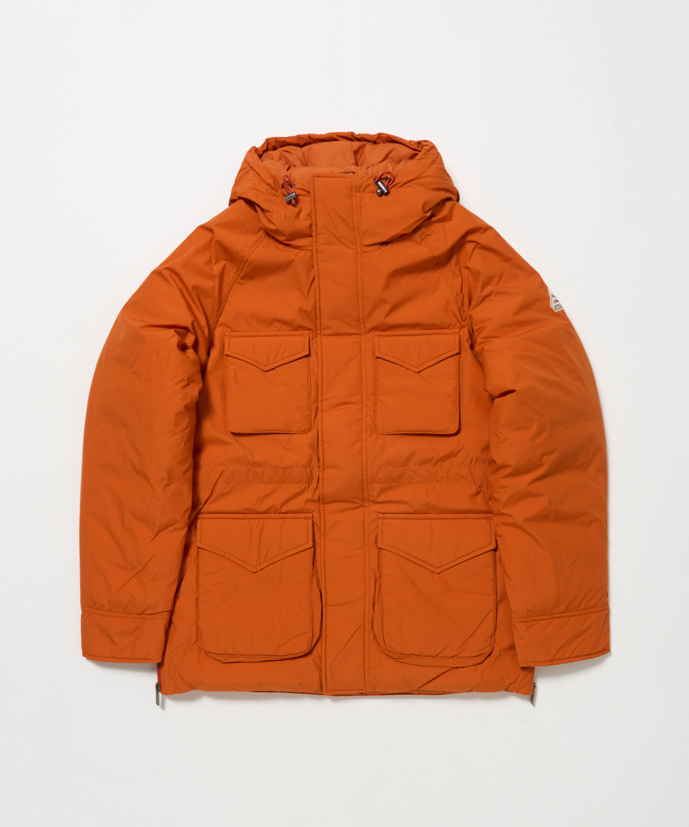 ミリタリーの名作フィールドジャケットをモチーフにマウンテンパーカーの要素を加えてアレンジしたダウンジャケット「バズス」。