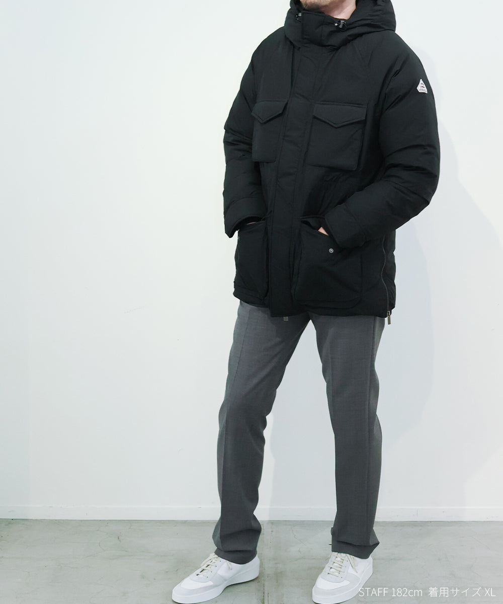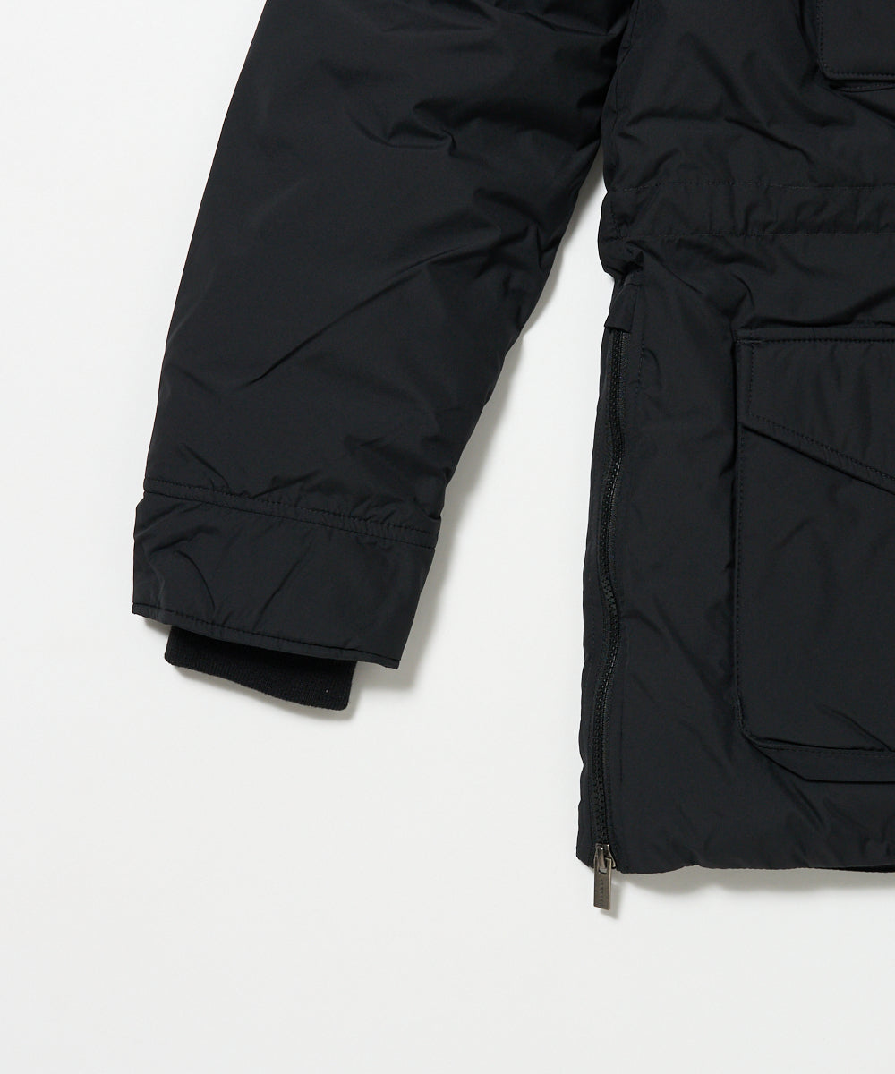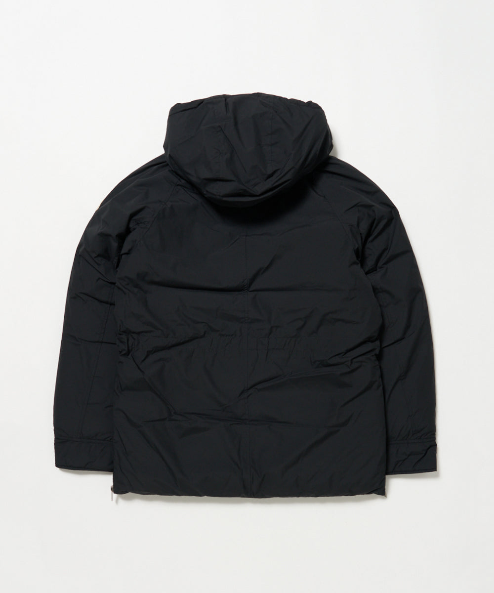フロントに配された4つのフラップポケットが特徴的で、ハンドウォーマーとしての機能も兼ね備えた下部ポケットはマチがあり、十分な収納性を確保しています。フィットやシルエットの調節が行えるウエストドローコードや側面のベンチレーションジッパーといった機能的でギミックの効いたディテールも魅力のひとつです。袖口はフィット感の良いリブカフによって冷気の侵入を防ぎ、防寒性をキープしています。