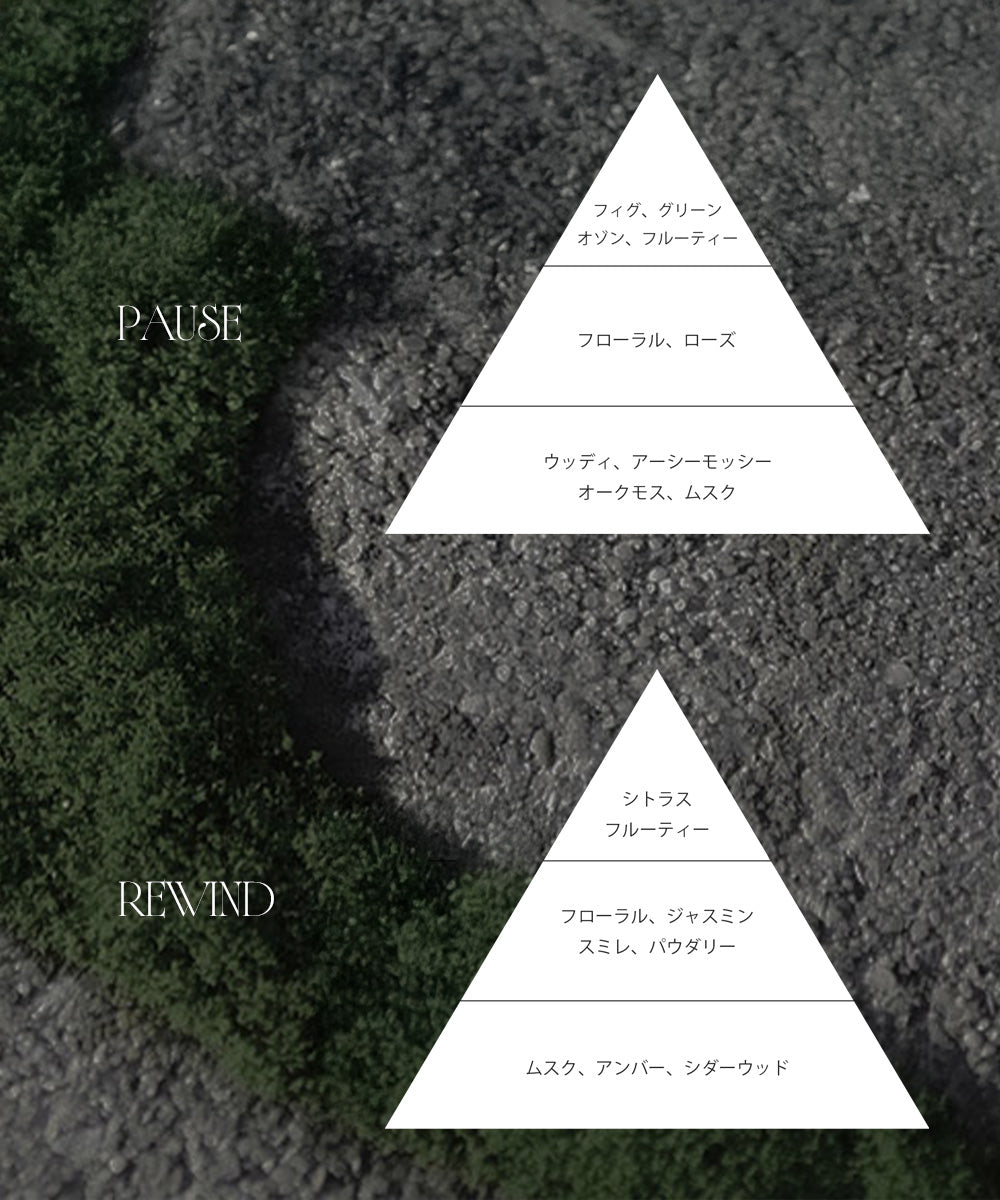 成分 | ■PAUSE 水、水添ポリデセン、BG、トリ(カプリル酸/カプリン酸)グリセリル、エチルヘキサン酸セチル、香料、シア脂、セテアリルアルコール、1,2ーヘキサンジオール、ビニルジメチコン、ステアリン酸ポリグリセリルー2、ステアリン酸グリセリル、ヒドロキシアセトフェノン、ステアリン酸ソルビタン、ステアリルアルコール、マイクロクリスタリンワックス、(アクリル酸ヒドロキシエチル/アクリロイルジメチルタウリンNa)コポリマー、(アクリレーツ/アクリル酸アルキル(C10ー30))クロスポリマー、トロメタミン、ヒノキ葉エキス、ティーツリー葉エキス、イソステアリン酸ソルビタン、シトラール、クマリン、アンザンジュエキス、エイランタイエキス、アニスアルコール、オイゲノー ■REWIND 水、水添ポリデセン、BG、トリ(カプリル酸/カプリン酸)グリセリル、エチルヘキサン酸セチル、香料、シア脂、セテアリルアルコール、1,2ーヘキサンジオール、ビニルジメチコン、ステアリン酸ポリグリセリルー2、ステアリン酸グリセリル、ヒドロキシアセトフェノン、ステアリン酸ソルビタン、ステアリルアルコール、マイクロクリスタリンワックス、(アクリル酸ヒドロキシエチル/アクリロイルジメチルタウリンNa)コポリマー、(アクリレーツ/アクリル酸アルキル(C10ー30))クロスポリマー、トロメタミン、ヒノキ葉エキス、ティーツリー葉エキス、イソステアリン酸ソルビタン、αーイソメチルイオノン、アンザンジュエキス、エイランタイエキス、シトロネロール、ファルネソール、シトラール、リモネン、イソオイゲノール、リナロール、ゲラニオール |