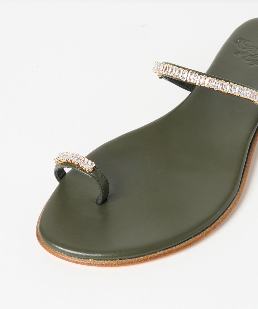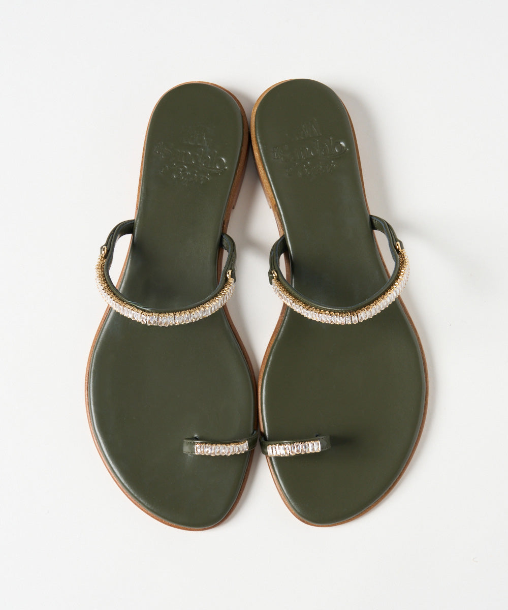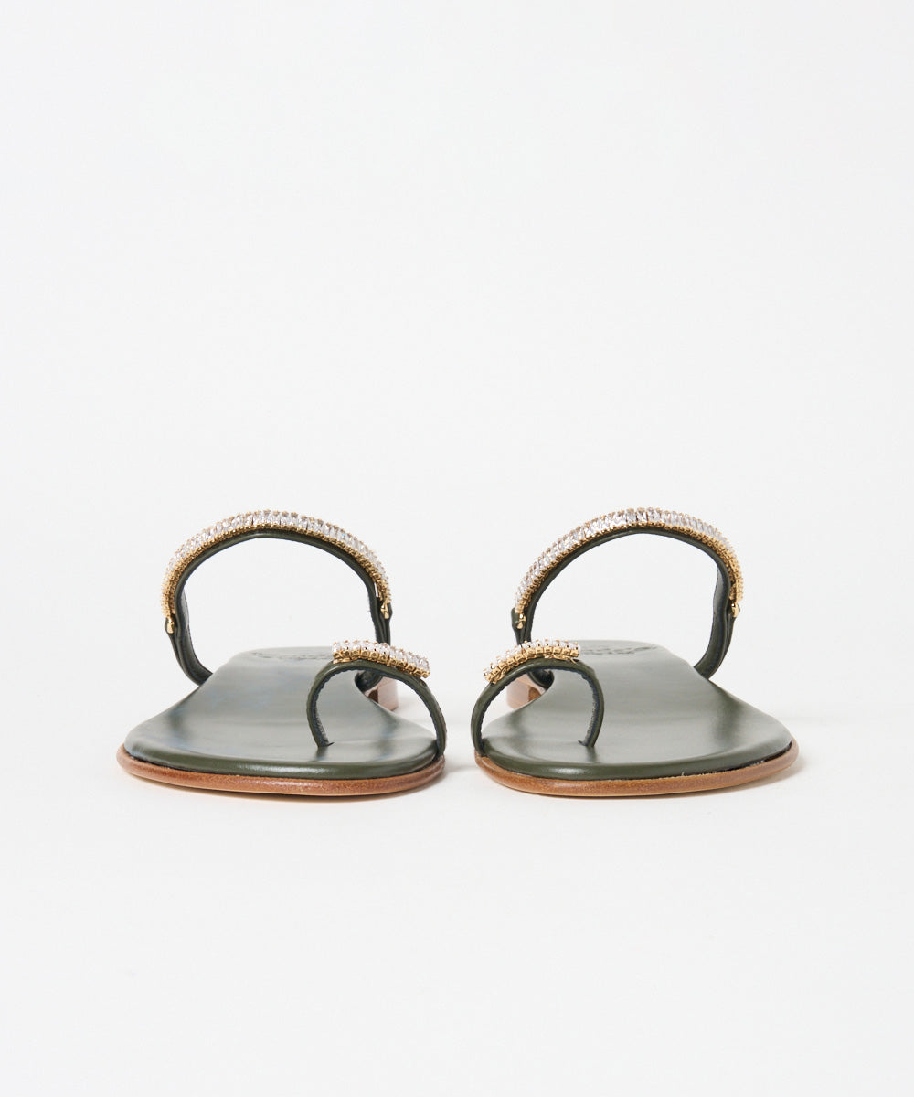 ミニマルなシルエットに、ビジューが散りばめられたストラップがエレガントで上品なサンダル。