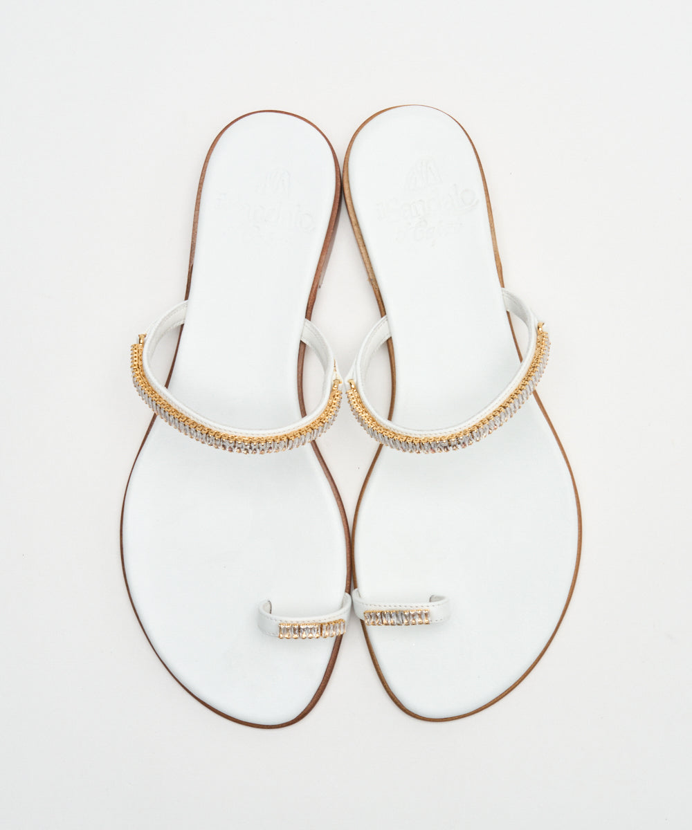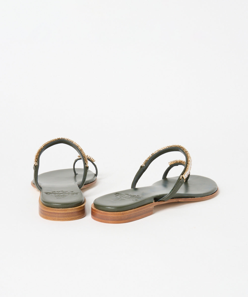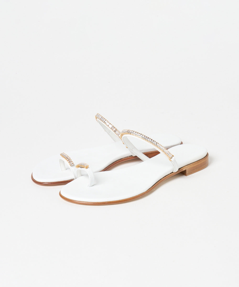 ミニマルなシルエットに、ビジューが散りばめられたストラップがエレガントで上品なサンダル。