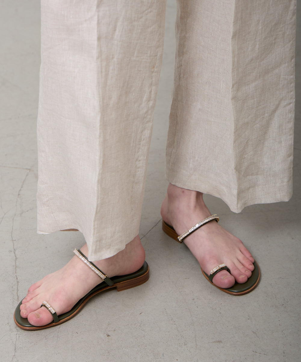 華奢なストラップとビジューの煌めきが女性らしい足元を演出します。 パンツ・スカート問わず、夏のスタイリングに華やかさをプラスしてくれる一足です。